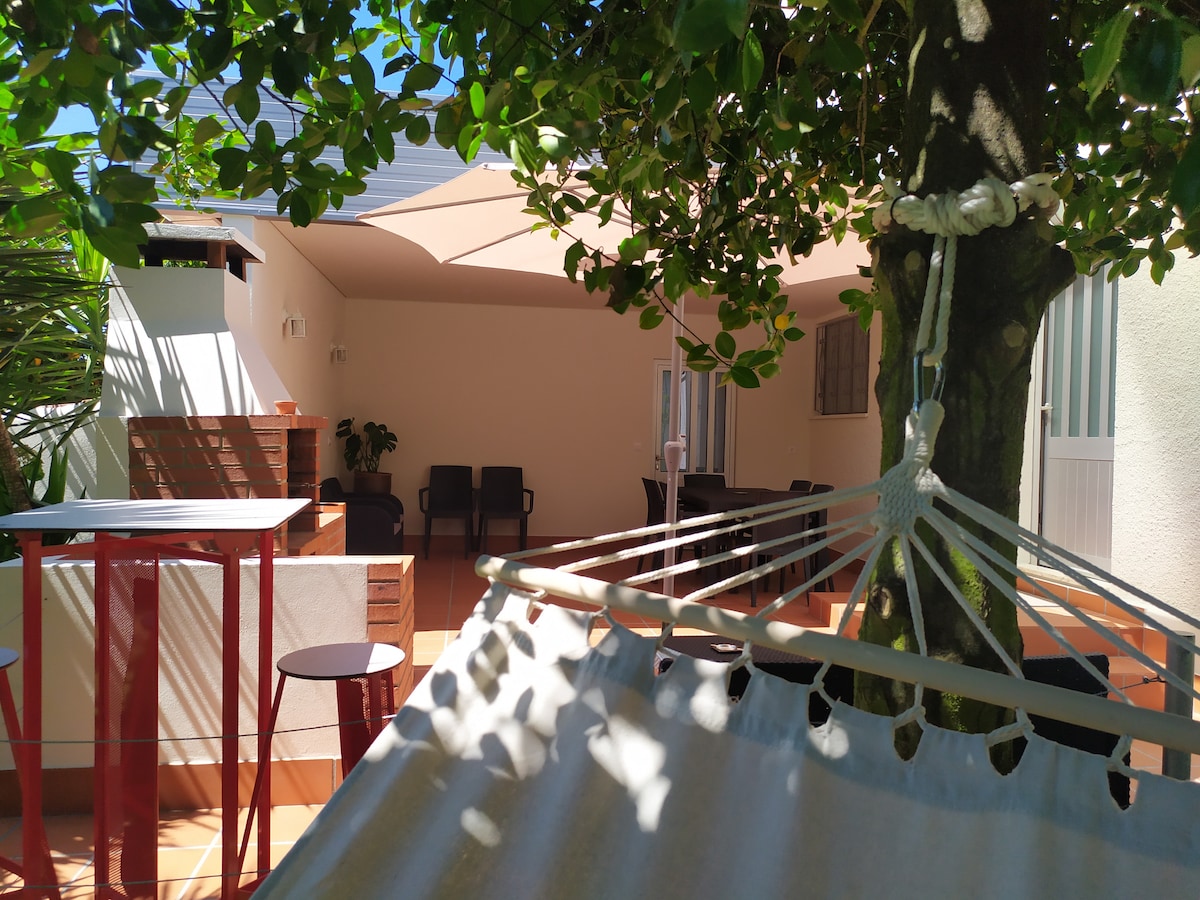 Estúdio com 2 pisos muito acolhedor e moderno com vista para piscina e jardim. Entrada independente. Quarto com sofá cama muito confortável e closet. Cozinha equipada com balcão de jantar. Piso superior de acesso por escada com 1 cama de casal e espaço para actividades. Espaço exterior privado com mesa refeições