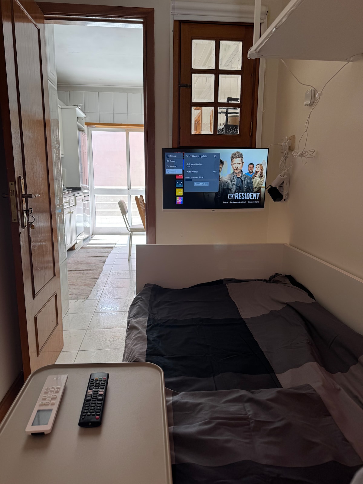 Small bedroom but with access to great shared apartment and shopping, at Rua Nova de Santa Cruz. Located at just 100m from MICAMPUS, 500m from CAMPUS GUALTAR (U.Minho). A delicious breakfast is waiting for you inside a dedicated combi refrigerator, plus coffee, tea. A dedicated Air conditioning Beko 9000 btu is inside your room.