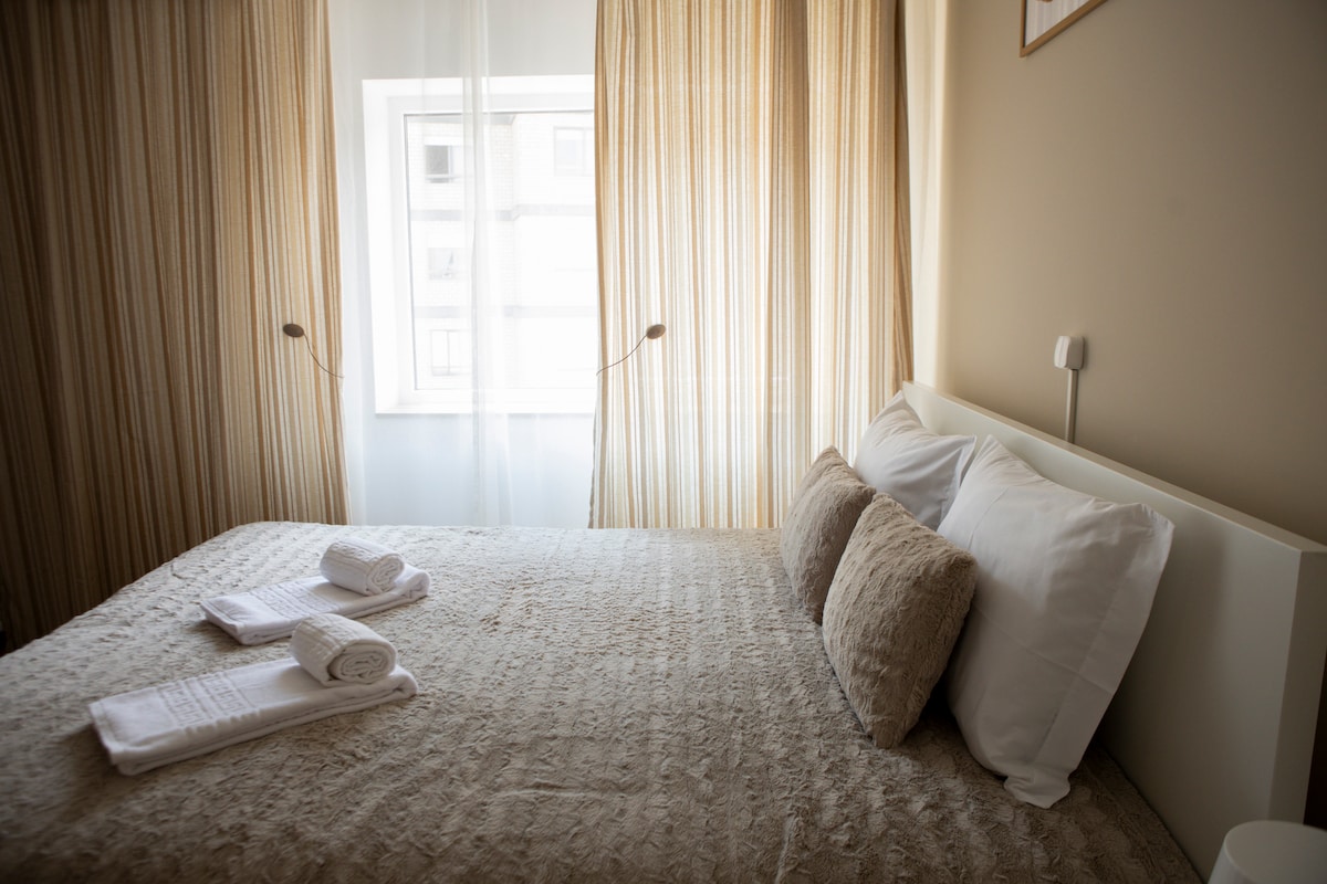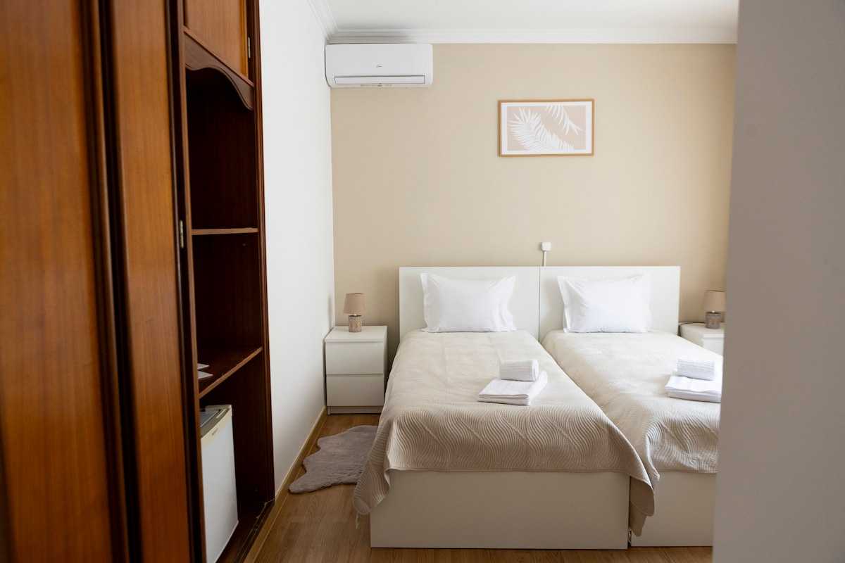 Quarto Duplo Aconchegante no Coração da Cidade. Com cama de casal, casa de banho privativa, Wi-Fi, armário espaçoso, secretária ideal para trabalhar, secador de cabelo e chaleira elétrica para preparar as suas bebidas favoritas. Situado no 1º andar (acesso por escadas), este espaço combina conforto e localização privilegiada. Está rodeado de restaurantes, cultura, lazer e todas as experiências que a cidade tem para oferecer — tudo a poucos passos da porta.