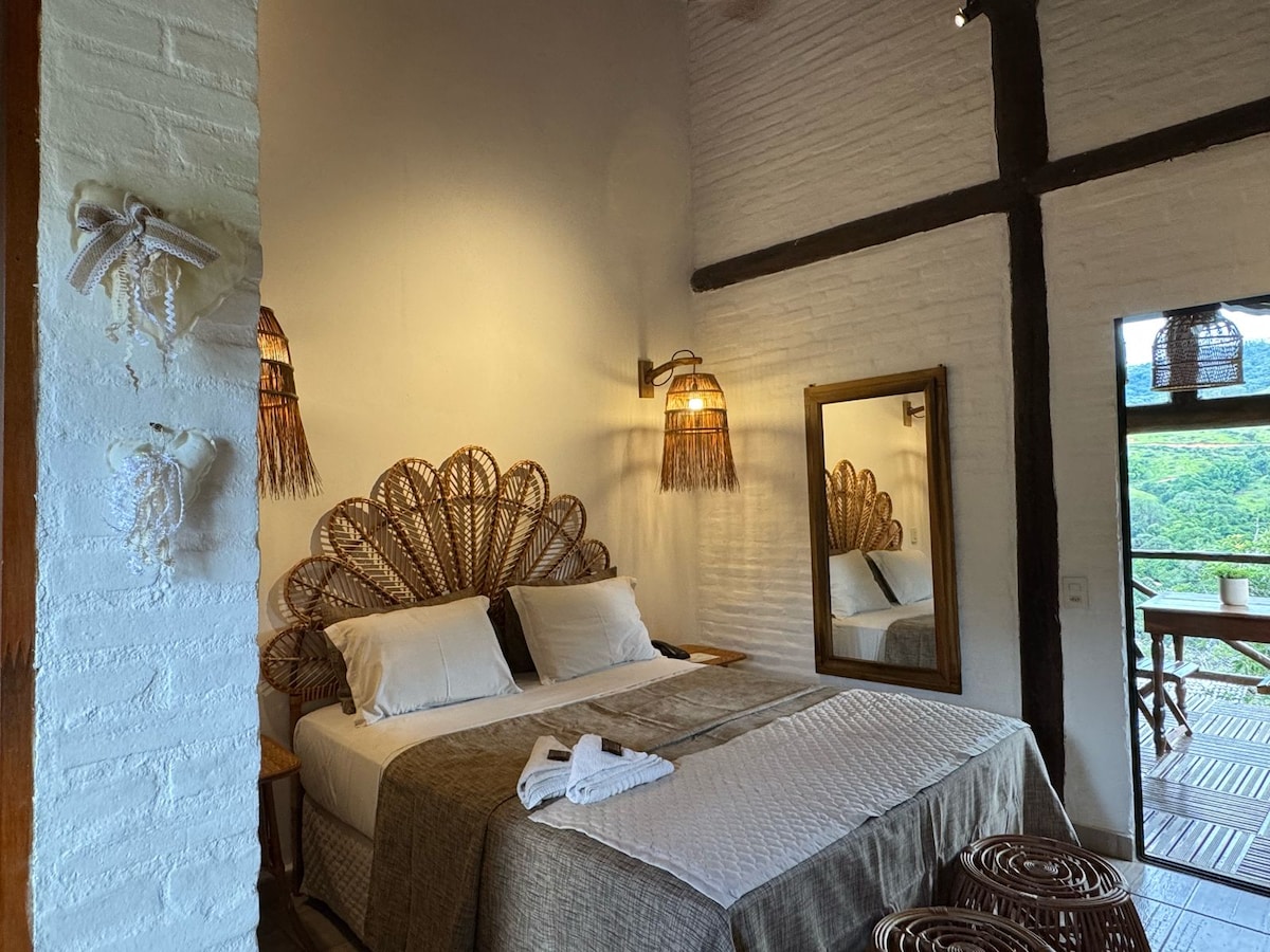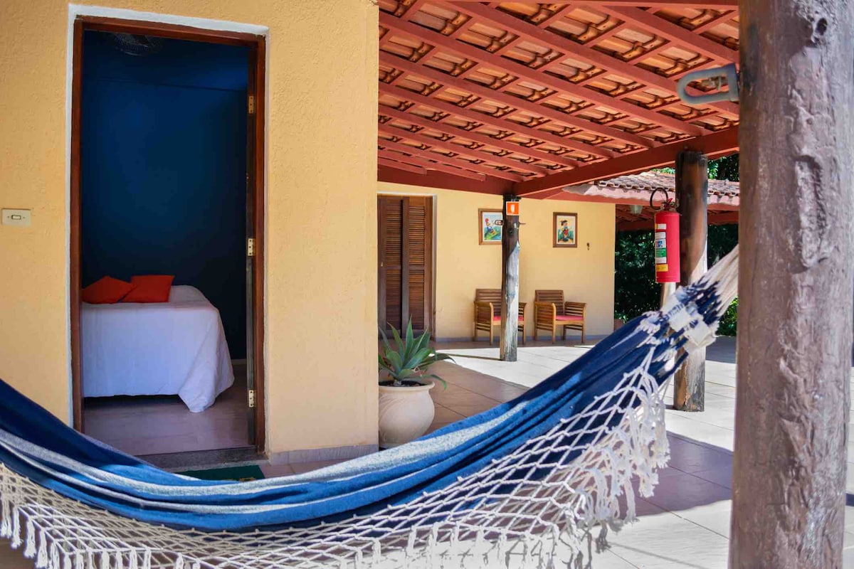 Oferecemos um quarto de casal no piso térreo e um colchão de solteiro no mezzanino. Há um banheiro interno e um box com ducha independente.