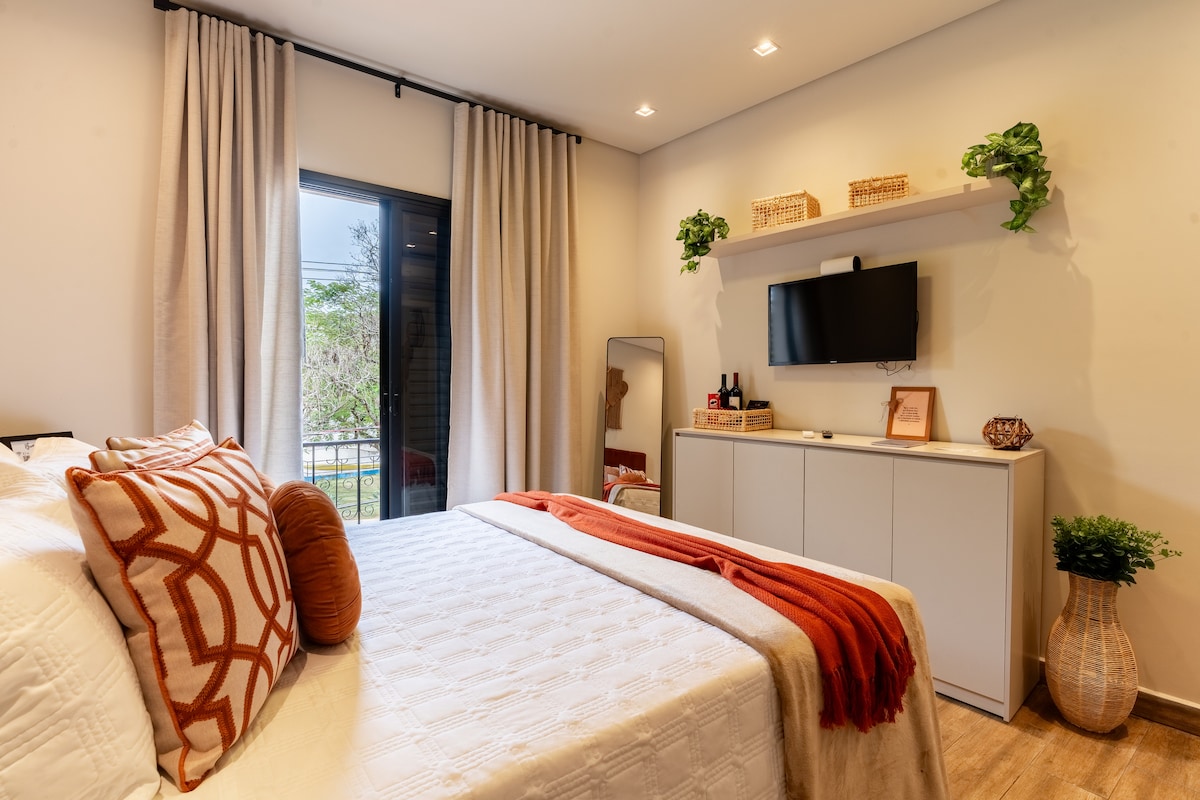 • Smart TV 32” • Ar-condicionado • Internet Wi-Fi 1 Gb • Frigobar exclusivo • Máquina de café Dolce Gusto • Roupa de cama e banho incluídas • Amenities premium: sabonete líquido para mãos e corpo • Decoração moderna e ambiente climatizado Na cozinha gourmet compartilhada, você encontra • Micro-ondas • Torradeira • Cooktop • Churrasqueira • Geladeira com freezer Ideal para preparar refeições leves, armazenar bebidas e aproveitar momentos descontraídos com vista para a praça