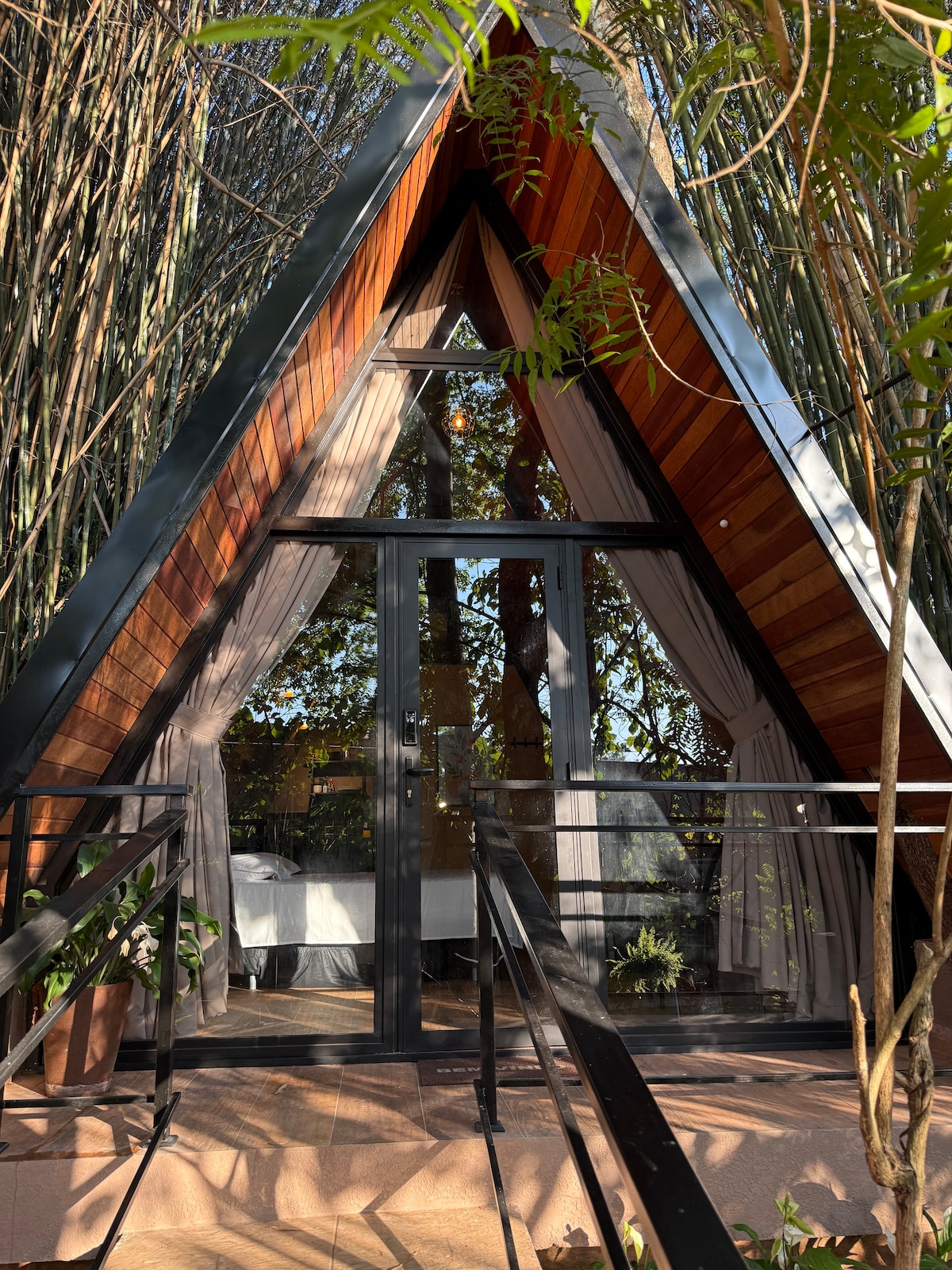 Chalé rústico em meio à natureza, ideal para até 3 pessoas. Conta com cama de casal e cama de solteiro, suíte com banheiro privativo e chuveiro quente, mini cozinha equipada, TV com canais, ar-condicionado e Wi-Fi. Desfrute de uma vista encantadora e do contato direto com a natureza, com macaquinhos e pássaros por perto. Um refúgio tranquilo e confortável, perfeito para casais, pequenas famílias ou amigos que buscam descanso e conexão com o verde.