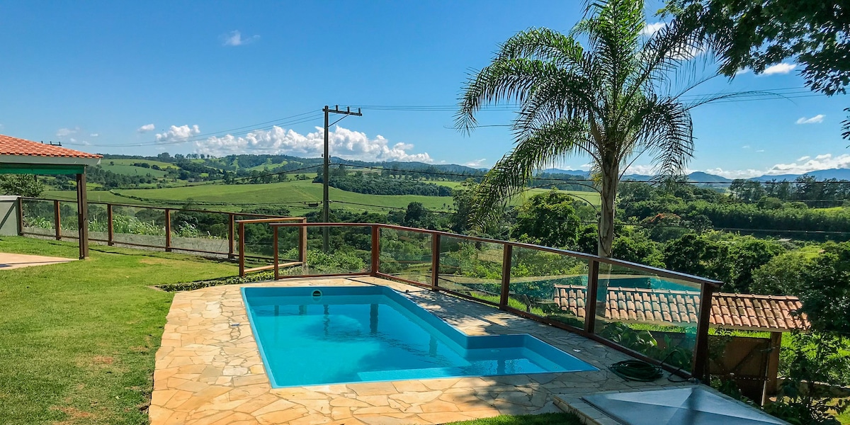 Chácara com a melhor vista de toda região, no verão, piscina com prainha para crianças, muito espaço para conversar, curtir e relaxar com a família e amigos. No inverno curtir um friozinho gostoso em volta da fogueira é a dica. Churrasqueira, cozinha super equipada, área de fogueira . Internet pra quem não quiser se desconectar, ou quiser ver um filme. 3 quartos, sendo 2 suítes e mais um banheiro social. acesso fácil, todo asfaltado. um belo nascer do sol, noites tranquilas. para quem busca paz!