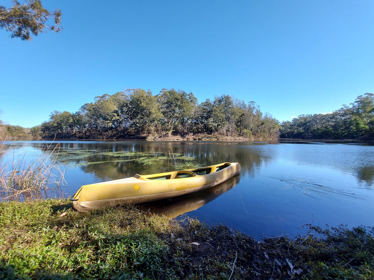 Get away from it all when you visit Mrs Grace’s rustic bush retreat at Moruya. LGBTQI friendly 🌈 Enjoy big starry skies and a myriad of bird life. Wander down to the Moruya River past kangaroos, and wombat holes. Lounge under the wisteria with a picnic between swims, or in winter cozy up by the fire with a book or jigsaw. In the warmer weather, book our free kayaks, and paddle 1km upriver to “Yaragee” the local swimming spot, or downriver into town for the more adventurous.