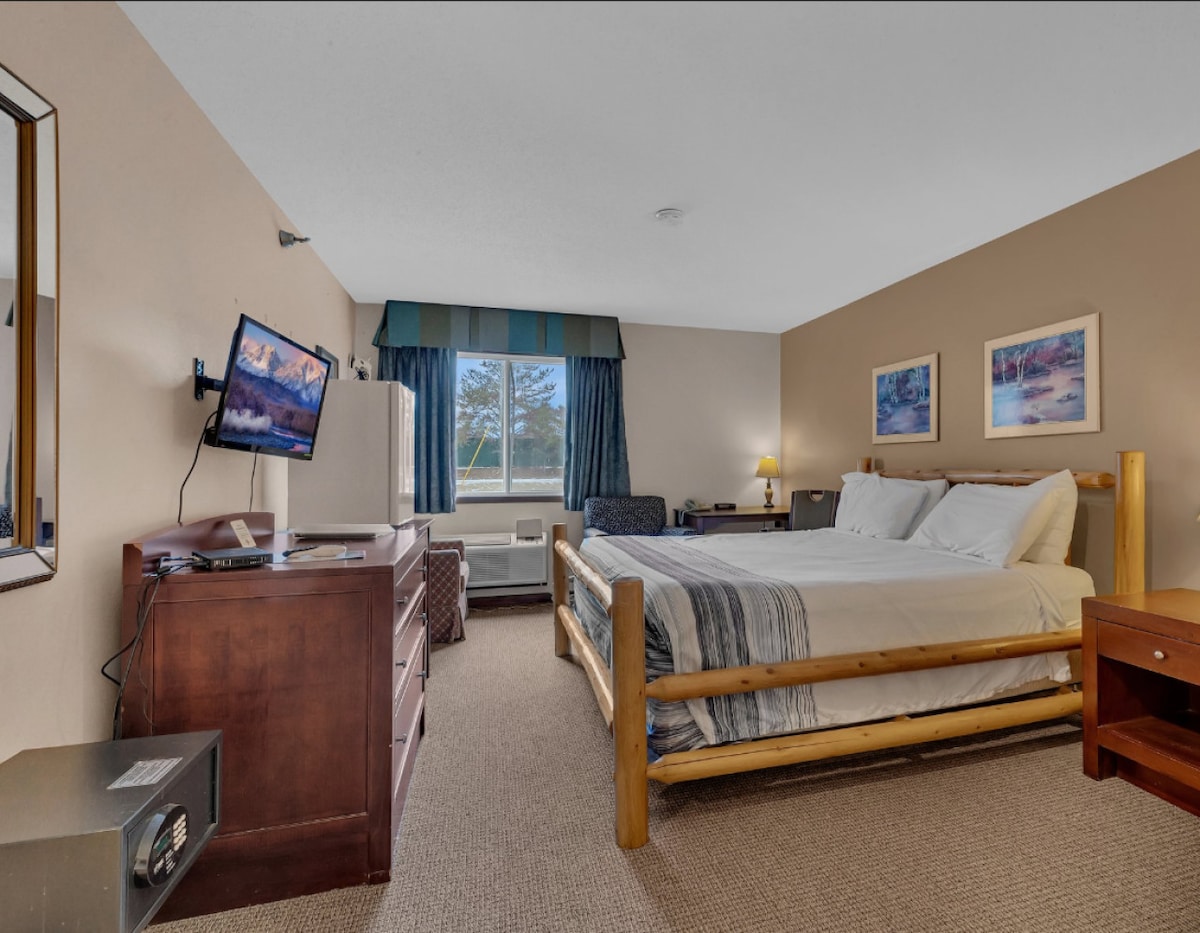 Relax in our King Room at Nisswa Hotel & Suites, featuring plush bedding, private bath, and complimentary WiFi. Guests enjoy access to the indoor pool, sauna, and cozy lounge. Just minutes from Gull Lake and Brainerd International Raceway. Each room features a brand-new, ultra-comfortable king-size bed with fresh comforters and pillows, a private bathroom, flat-screen TV, complimentary WiFi, climate control, and a private kitchenette ready for use. This is an ADA compliant unit.