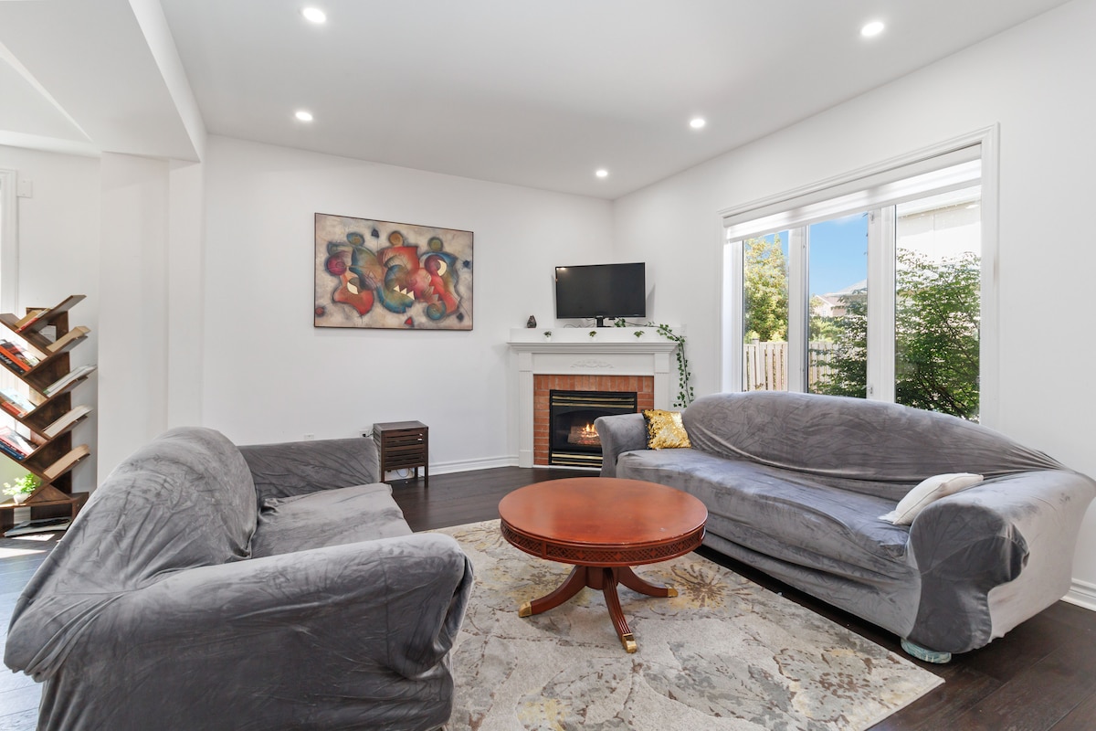Forget your worries in this spacious, serene and unique house! Large backyard with a Swim Spa to enjoy! Backyard filled with fire places! 6 Bedroom, 7 beds, 4 full baths, 4 offices, 3 family rooms, 9 TV, equipped kitchen, patio, board games, BBQ grill, fire place, Tesla charger. Quiet yet central from downtown Oakville, highways, groceries, shopping, bars, restaurants, cafe's and much more! Always professionally cleaned. For elderly guests a bedroom and full bath is on ground floor.