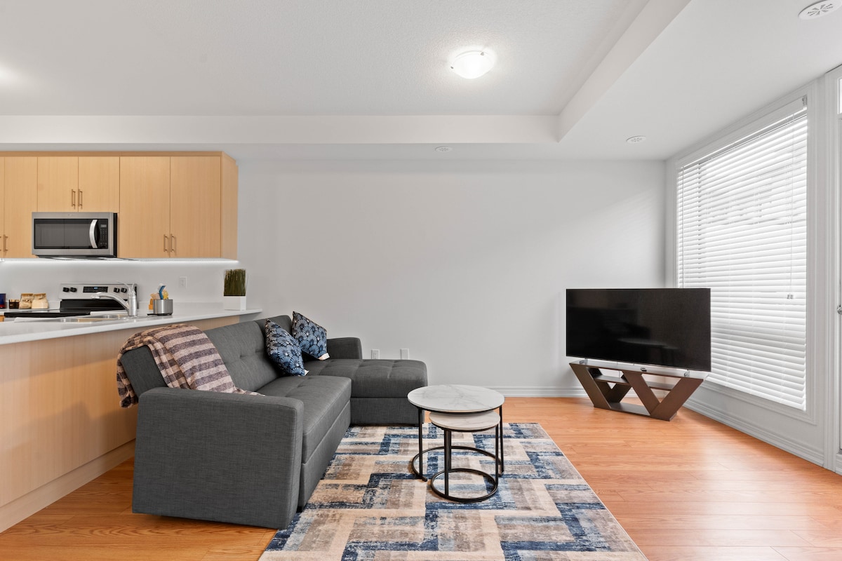 ⭐ Welcome to our modern, newly built 2 BR, 1.5 Bath Townhouse in Brampton East, featuring: ✔ Modern design with an open-concept layout - lots of natural light ✔ Fully equipped kitchen for preparing meals ✔ Two fully furnished bedrooms ✔ Comfortable bedrooms with high-quality linens ✔ Cozy family room with a large flat-screen TV ✔ Super-fast internet ✔ Near to Pearson Airport, Vaughan Mills Mall, Claireville Conservation Area Book your stay with confidence and make unforgettable memories!