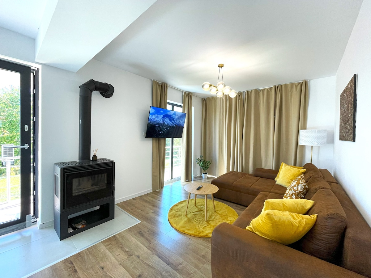 Entire groundfloor apartment in beautiful villa with garden, in Bunloc area of Sacele, Brasov. The apartment has separate entrance and consists of: - bedroom with matrimonial bed and ensuite bathroom with bathtub and shower - bedroom with matrimonial bed - bathroom with shower - living room with extensible sofa bed - open kitchen, equipped with oven, electric hob, fridge, dishwasher, washing machine. You'll find a generous garden and big terrace, sunbeds, outdoor dining table, barbeque.