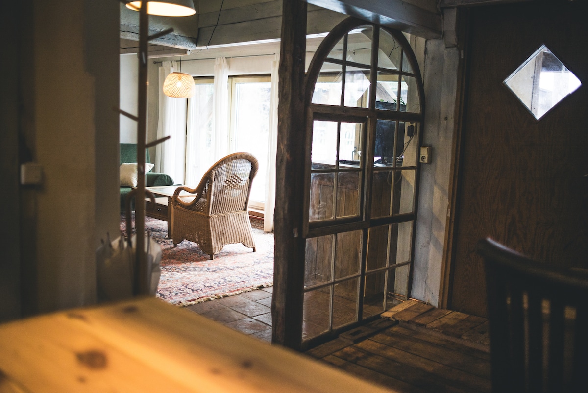 Gemütliche Ferienwohnung (ca. 75 bzw. 90 m²) in denkmalgeschütztem Fachwerkhaus. Großzügige, voll ausgestattete Küche mit Kachelofen, Wohnzimmer mit Schlafcouch, Leseecke und Kachelofen, 1 Schlafzimmer (1-2 Personen) oder 2 Schlafzimmer (ab 3 Personen), jeweils mit Doppelbett, Badezimmer mit Dusche und Sauna. WLAN in der ganzen Wohnung mit kostenlosem Internetzugang. Zentralheizung in allen Zimmern. Eigener Garten. Gegen Aufpreis verfügbar: Transfer v.Bhf,Einkaufservice,Leihfahrräder, Kanus,Gym