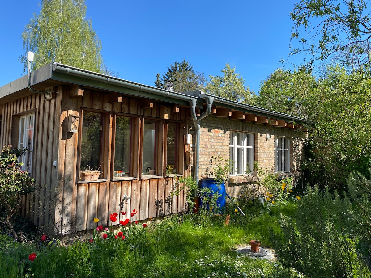 Wir bieten einen kleinen gemütlichen und liebevoll eingerichteten Bungalow mit Garten für max. 3 Personen an. Der Bungalow verfügt über ein Schlafzimmer mit Doppelbett (1,40 m breit) und hat im Wohnzimmer eine Couch mit Schlaffunktion wo eine weitere Person schlafen könnte. Der Bungalow liegt in ruhiger ländlicher Umgebung am Stadtrand von Berlin.