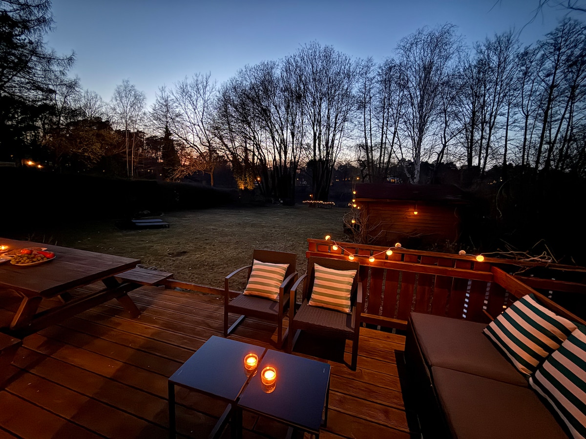 Perfekt für Treffen mit Freunden und Familienurlaub. Gemütliches, modernes Blockbohlenhaus für bis zu 6 Personen zwischen Berlin und Potsdam mit großer Terrasse zum Relaxen. Jetzt ist endlich Zeit, wieder das Schöne zu genießen. Ausflüge in die Natur, Sightseeingtouren nach Potsdam oder Berlin, Shopping im nahegelegenen Outletcenter, eine Schifffahrt von Kladow nach Wannsee usw... Oder einfach entspannen, runterkommen und sich zurückziehen in das warme kuschelieges Ambiente eines Holzhauses.