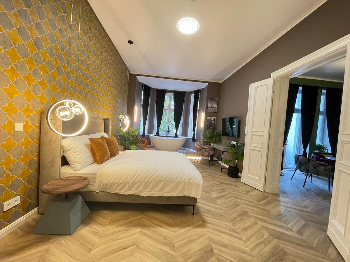 🏠 Charme am Park Unser 120 m² Apartment in der 1. Etage mit Balkon und Parkblick bietet 2 Schlafzimmer mit Doppelbetten, eines zusätzlich mit freistehender Badewanne, das andere mit Schlafcouch. Das großzügige Wohnzimmer mit Bar-Ecke und Balkon lädt zum Entspannen ein. Die Küche ist voll ausgestattet, inkl Geschirrspüler. 📍Lage Nur 2 km vom Alexanderplatz. Direkt am Bötzow-Park mit Cafés, Restaurants und Einkaufsmöglichkeiten in der Nähe. 💡Hausregeln Rauchen verboten Partys verboten