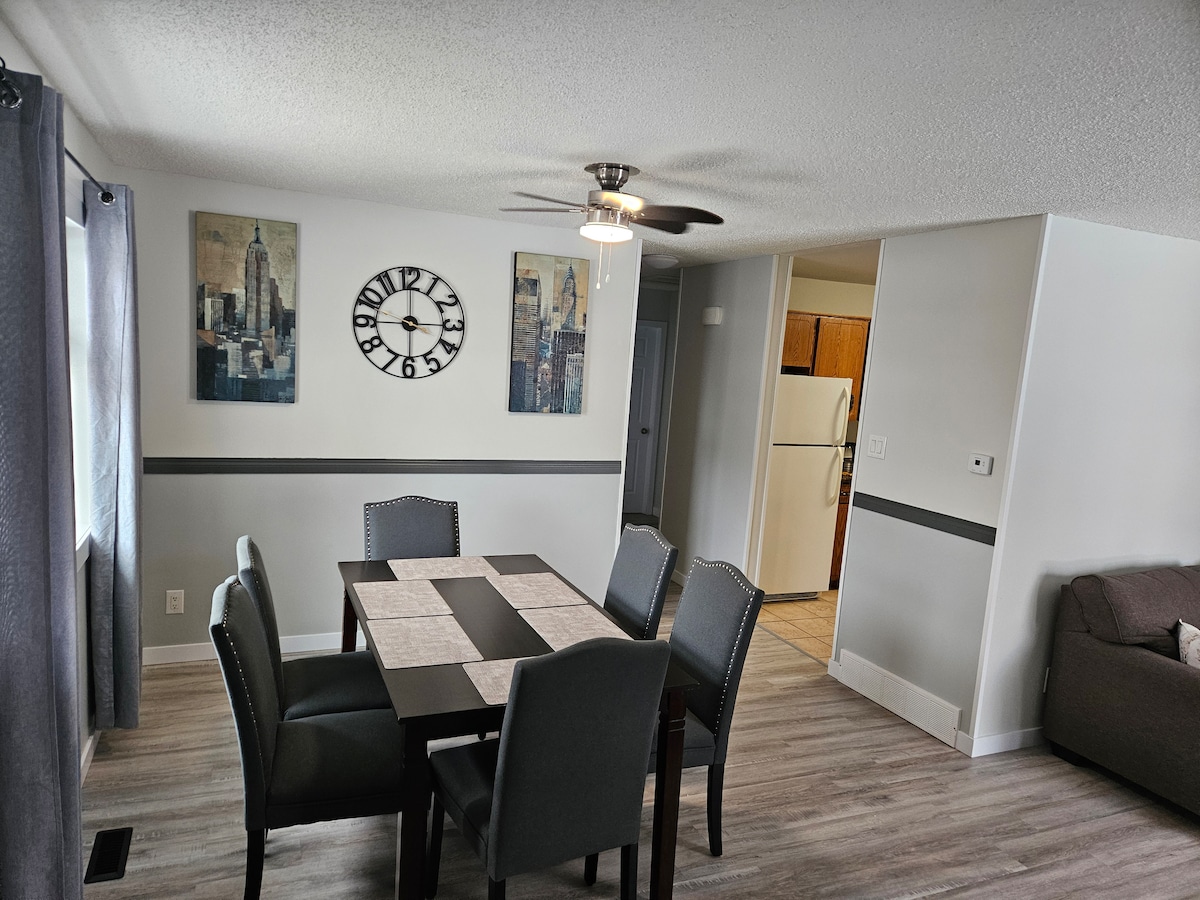 This is a spacious 3 bedroom 1/2 duplex. 1 queen 1 double upstairs and 1 double downstairs., all bedrooms have smart tv . Huge rec room down stairs with hundreds of dvd movies you can enjoy if you want to get away from your friends upstairs and watch a movie downstairs. The kitchen is fully equipped....microwave, slow cooker, dual air fryer, coffee pot and single cup There is a fenced cement patio on the side of the house with a table and chairs and a small BBQ smoking and vapeing outside only