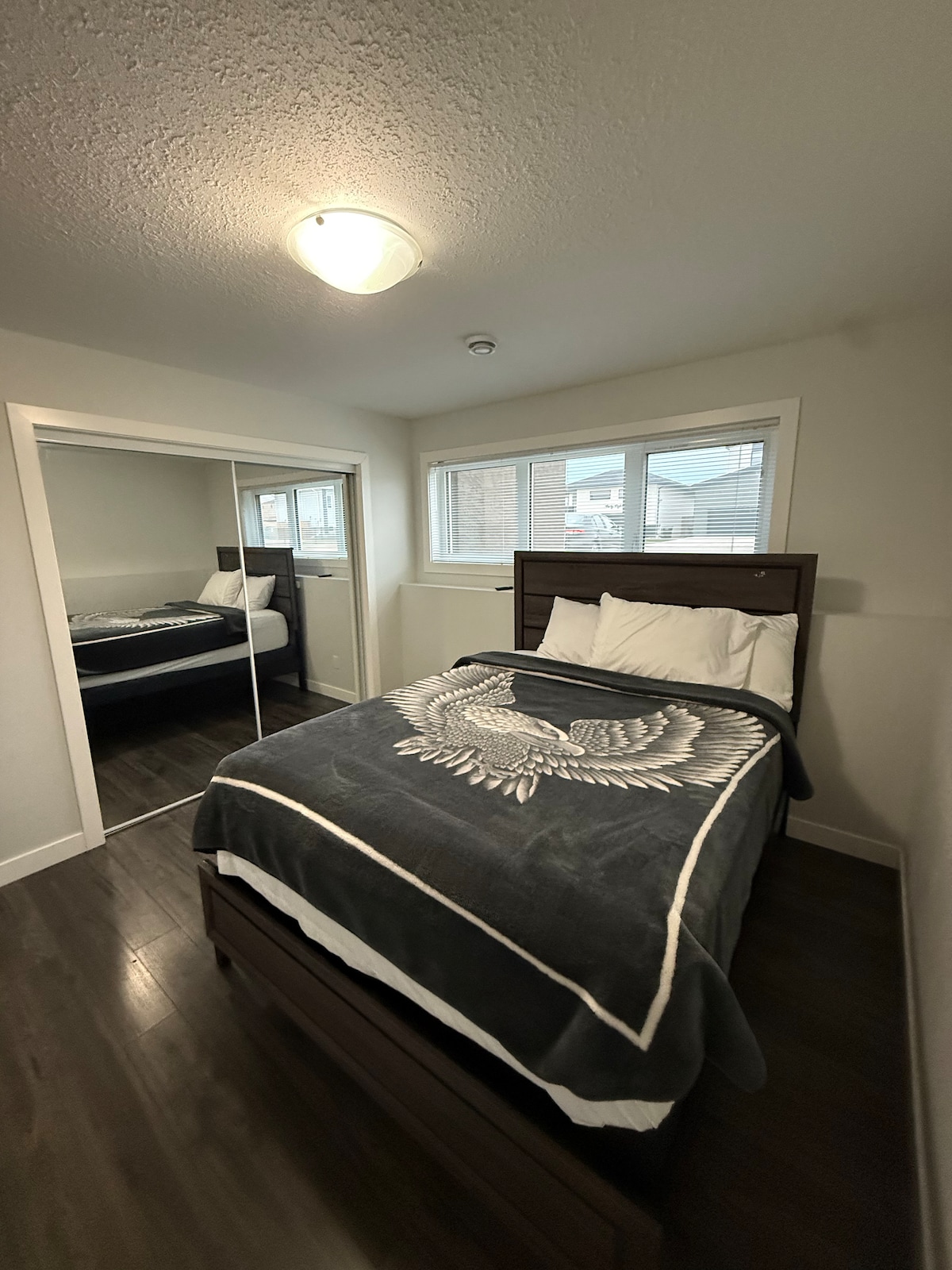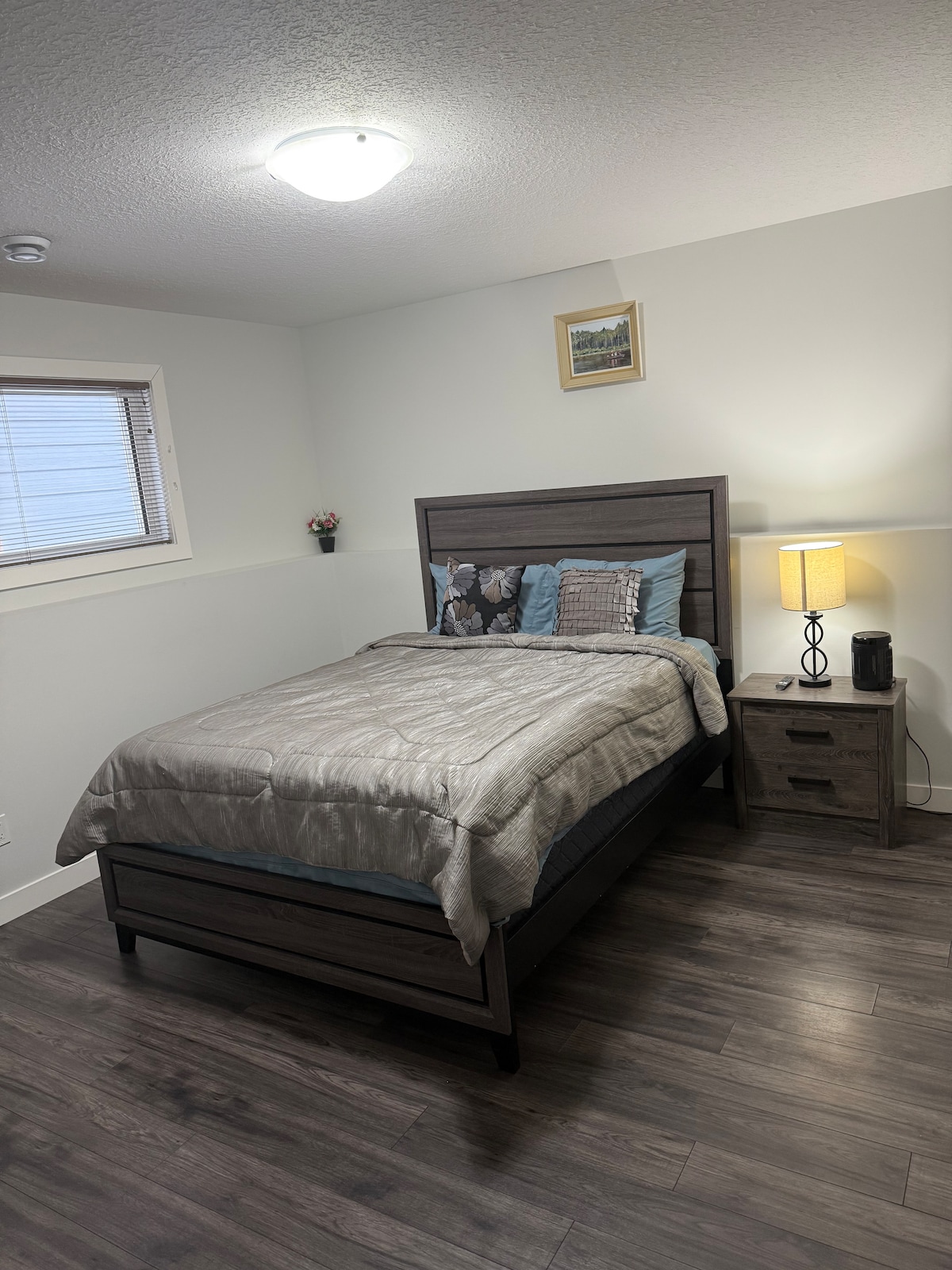Quiet basement suite with separate entrance, close to all amenities in Brandon. King bed for your comfort, a desk if you’re here on business, a large living space with electric fireplace, a pull out couch, and spacious kitchen with island!