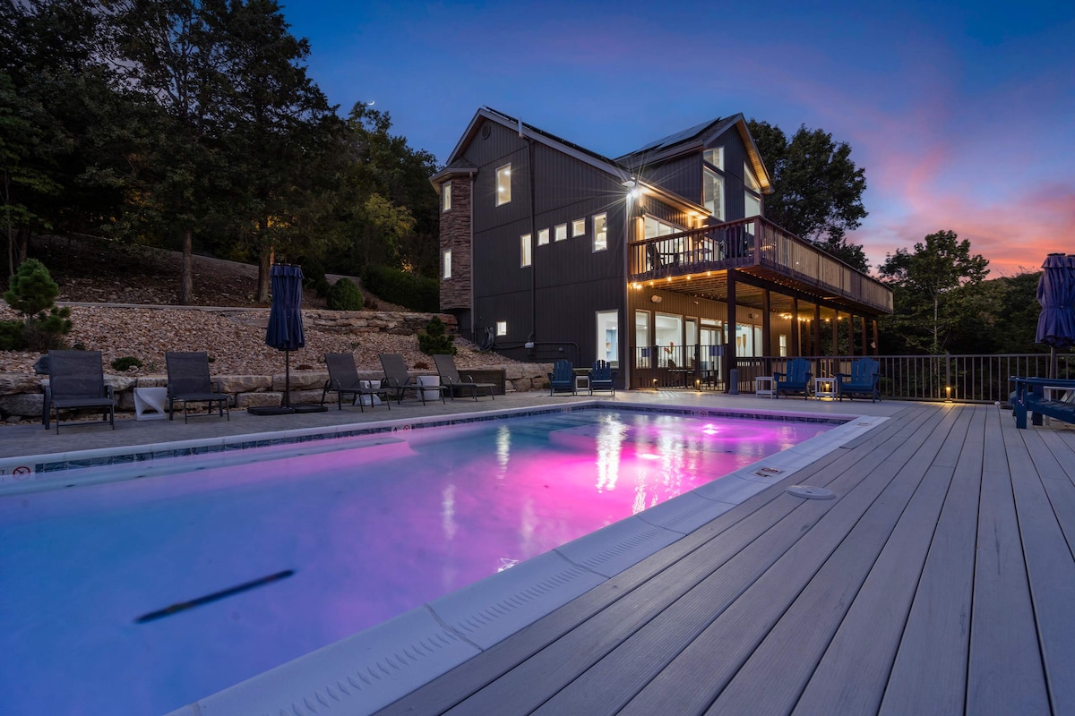 Spacious Branson Canyon lodge for up to 19 guests plus little kids. Enjoy a year-round private hot tub, seasonal 2-level pool with splash pad, and a game room with pool table, arcade & more. Multiple decks with Ozark Mountain views, large kitchen, and dining for big groups. Just minutes to Table Rock Lake, Branson Landing, golf, and Silver Dollar City. Perfect for family reunions, multi-family getaways, and retreats.