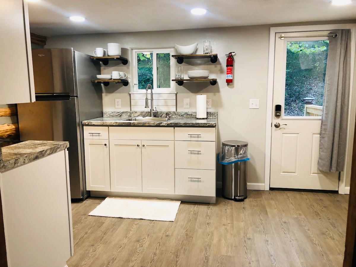 Take it easy at this unique and tranquil getaway. This one bedroom cabin overlooking a creek is minutes away from restaurants and entertainment yet secluded enough for privacy and peace. It has a full kitchen, 50 inch tv, WiFi, coffee bar, deck and much more! You now have the option as a two bedroom if you need more space check out our other listing with the original creekside log cabin! Book your stay today!