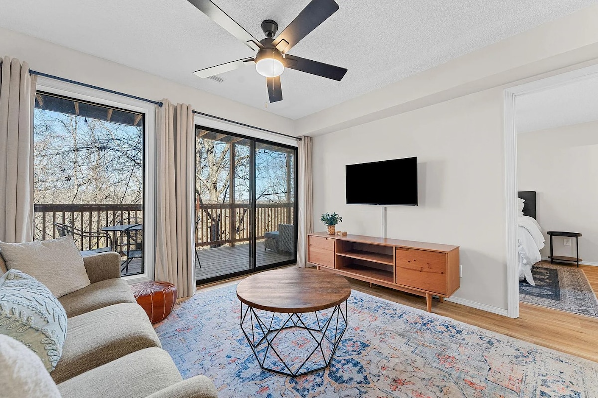 Peaceful, centrally located newly renovated walk-in 1 bedroom Condo ideal for couples or small families. This beautiful getaway includes new flooring, a kitchen, a queen size sleeper sofa, a heavenly reclining chair to unwind while watching the big screen TV. Enjoy a great night's sleep in a luxurious king size bed. Located just minutes from the Entertainment District, fabulous dining and shopping options, Lake Taneycomo Marina and hiking, fishing, boating and swimming at Table Rock Lake.