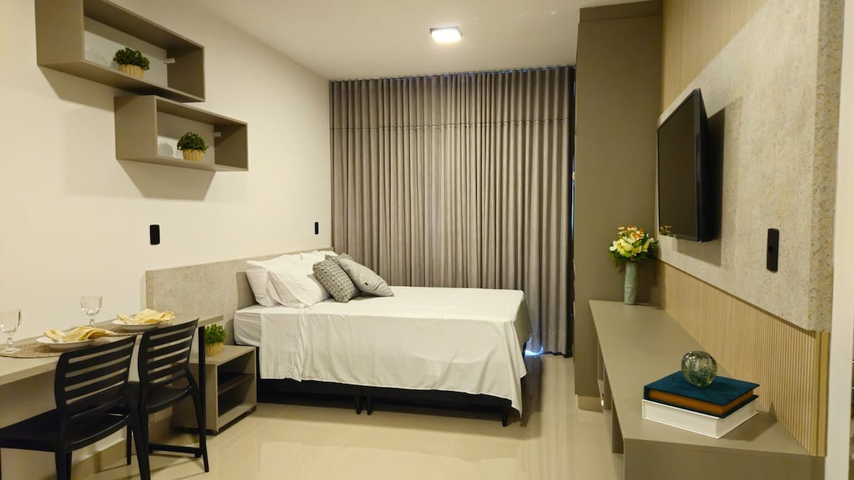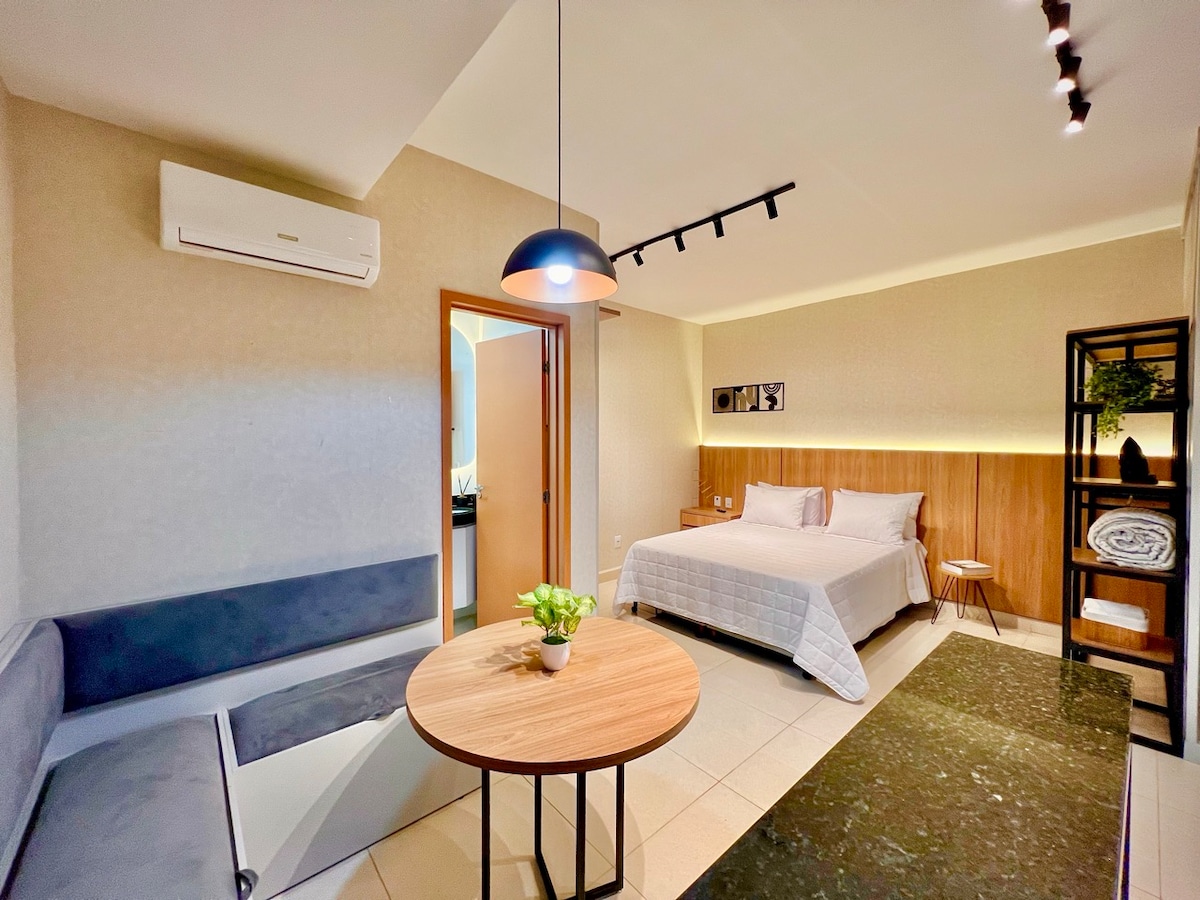 Descubra um refúgio de elegância e conforto próximo á faculdade de medicina Uni evangélica e hospitais em Anápolis. Este estúdio exclusivo foi projetado para oferecer uma experiência inigualável, cada elemento traduz sofisticação e bem-estar. Cada estadia é um convite para viver momentos de puro requinte, em um ambiente que inspira tranquilidade, estilo e prazer. Seja para relaxar ou trabalhar. Bem-vindo ao seu refúgio de luxo em Anápolis.