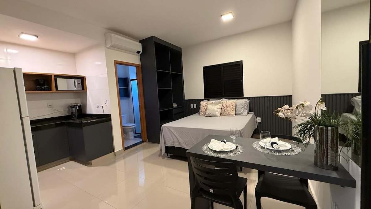 Kitnet nova e aconchegante no centro de Anápolis! Hospede-se em um espaço moderno, com móveis novos e localização privilegiada! Perfeito para trabalho ou lazer, o apartamento conta com cama confortável, cozinha equipada, Wi-Fi rápido e bem decorado. Segurança garantida com câmeras 24h. Próximo a mercados, farmácias e restaurantes. Conforto e praticidade em um só lugar! Reserve agora e aproveite sua estadia!