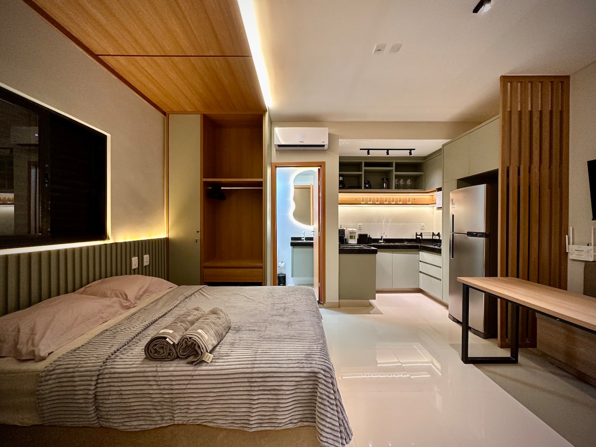 O Studio é perfeito pra quem busca um espaço acolhedor. A cozinha é um charme - toda equipada com armários planejados, equipamentos e utensílios elétricos. O quarto é um verdadeiro refúgio! Sabe aquela sensação de dormir em hotel 5 estrelas? É exatamente isso que você vai sentir aqui. O colchão é extremamente confortável. Você pode relaxar ouvindo uma música ou assistindo TV O banheiro contém uma ducha potente e relaxante. Tudo feito com muito cuidado e capricho pra que você se sinta bem! .