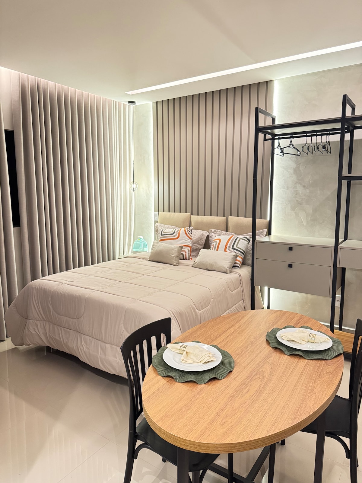 O Studio é perfeito pra quem busca um espaço acolhedor. A cozinha é um charme - toda equipada com armários planejados, equipamentos e utensílios elétricos. O quarto é um verdadeiro refúgio! Sabe aquela sensação de dormir em hotel 5 estrelas? É exatamente isso que você vai sentir aqui. O colchão é extremamente confortável. Você pode relaxar ouvindo uma música ou assistindo TV O banheiro contém uma ducha potente e relaxante. Tudo feito com muito cuidado e capricho pra que você se sinta bem! .