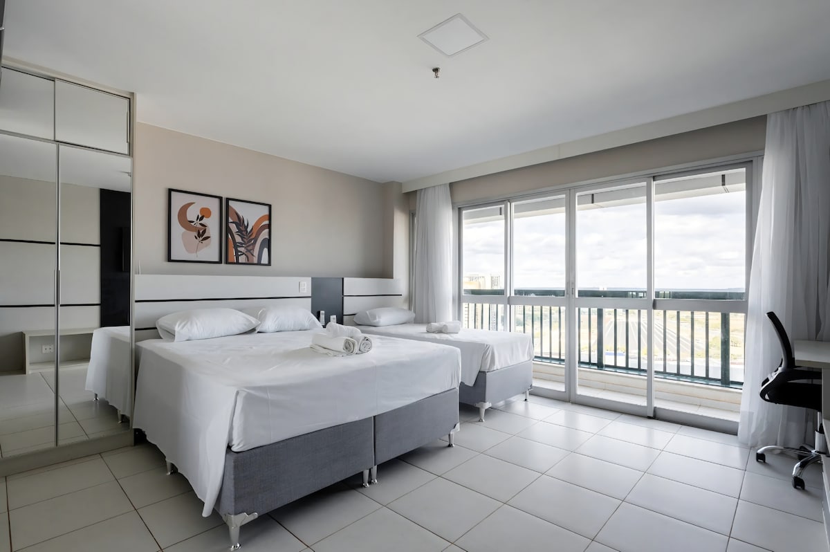 Flat reformado, espaçoso, com enxoval padrão hotel na região central de Brasília, perto de TUDO! Perfeito para hospedagem à trabalho ou a passeio, pra quem não quer perder tempo com deslocamento. O apartamento é amplo, a limpeza é impecável, com travesseiros e camas com proteção antialérgicas, em um local tranquilo voltado para a parte interna do complexo hoteleiro. O Hotel possui 2 restaurantes, segurança por câmeras, 2 lanchonetes, mini mercado e ponto de taxi na frente.