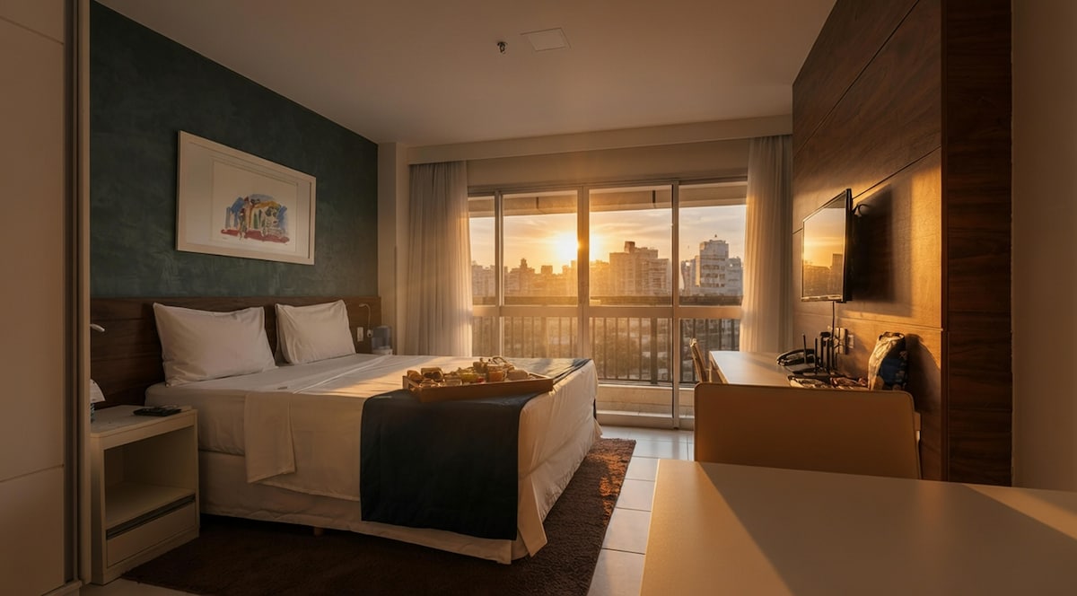 Studio sofisticado, funcional e charmoso no coração de Brasília, a poucos minutos do Congresso, tribunais, restaurantes, bares e pontos turísticos. Ambientes modernos, silenciosos e bem equipados: cama confortável, enxoval premium, Wi-Fi veloz, ar-condicionado, TV com streaming, bancada de trabalho com LED e cozinha gourmet. Condomínio residencial, seguro, com portaria 24h, garagem, academia e minimercado. Check-in eletrônico e atendimento atencioso da anfitriã.