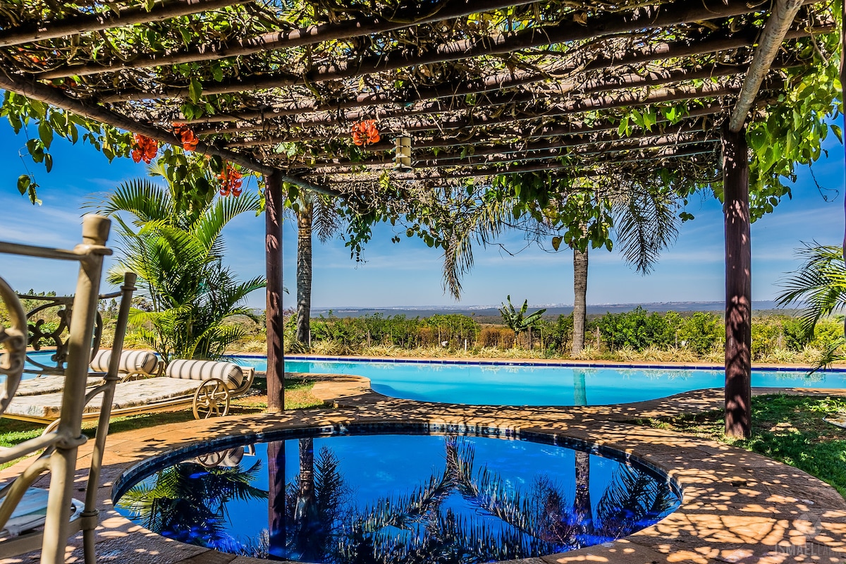 Relaxe com toda a família e ou amigos na chácara Recanto das Cores. Espaço exclusivo para os hóspedes! Aqui você terá tudo o que precisa para curtir e descansar. Temos uma piscina completa (não aquecida) com raia e "prainha"; jacuzzi aquecida (o aquecimento é cobrado a parte), sauna (cobrada a parte), parquinho, campo de areia e grama, churrasqueira, área coberta com lareira e vista para Brasília e 7 suítes individuais.