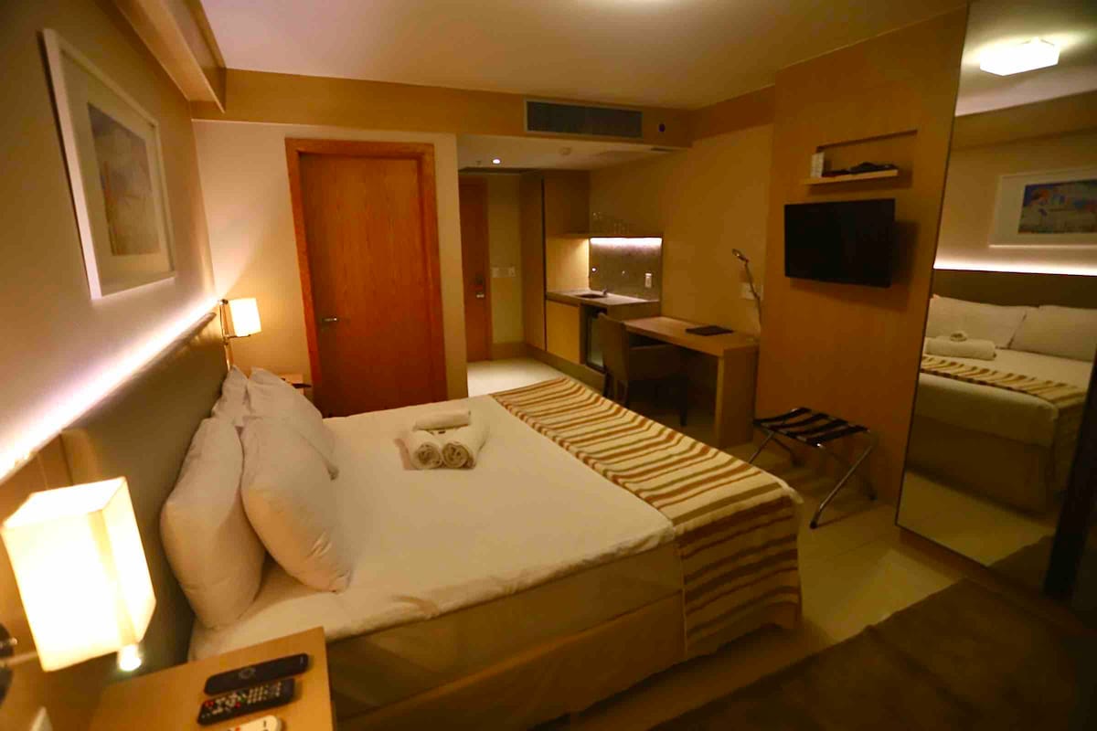 Nice view. Double bed, TV42', air cond, microwave and refrigerator. Dining table, countertop and large cabinet with mirror. Restaurant with beautiful terrace view and offers meals that can be requested (paid separately). Nearby shopping malls Conjunto Nacional and Brasilia Shop, and restaurants and convenience. Gym, sauna and swimming pool(2). Several BSA attractions are super close by. Children are not allowed in the apartment for security. Cleaning 1 time every 7 days w/full trousseau change.