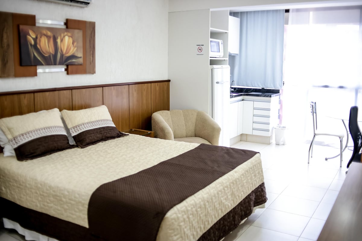 Suíte de 28m², com cama de casal, TV led 32, ar condicionado, cortina blackout, home office com cadeira de escritório, Wi Fi, guarda-roupas, criado mudo, mesa de refeições com 2 cadeiras, cozinha americana (pia, geladeira, micro ondas, cafeteira elétrica, pratos, copos e talheres) banheiro com chuveiro (toalhas, sabonetes e papel higiênico inclusos). Serviço de arrumação de quartos.