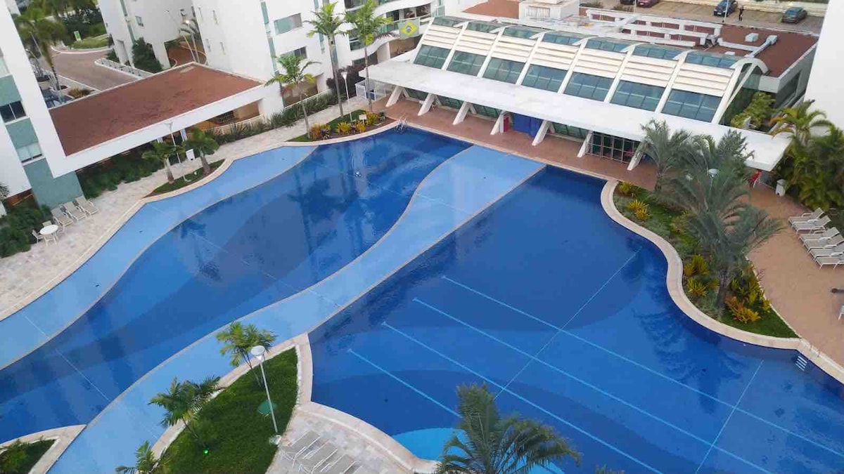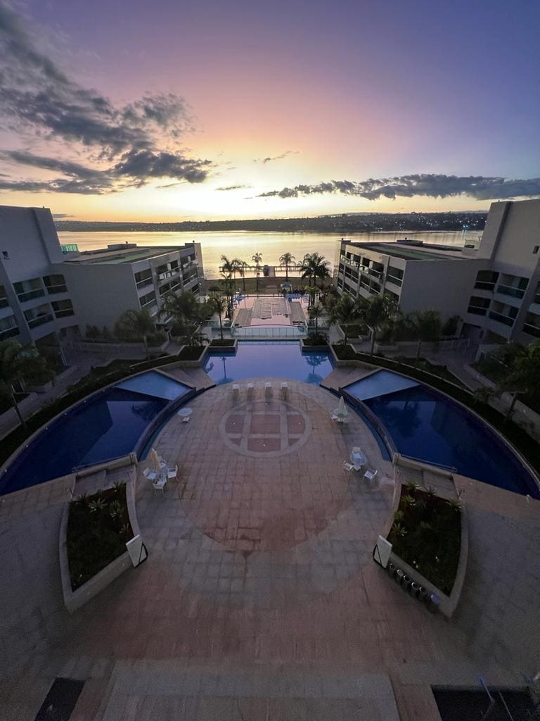 Flat com varanda com vista para área interna do condomínio, mais sossegado e longe do barulho da área de lazer, mobília completa, ar condicionado, cafeteria dolce-gusto, tv lcd com cabos HDMI e antena, apenas canais abertos, geladeira, microondas, armários, louças e roupas de cama e banho. 2 piscinas, academia, conveniência e parquinho. Perfeito para sossego, conforto e a beleza do lago, o prazer de viver em um Resort com tranquilidade e próximo ao centro político, unb e embaixadas.