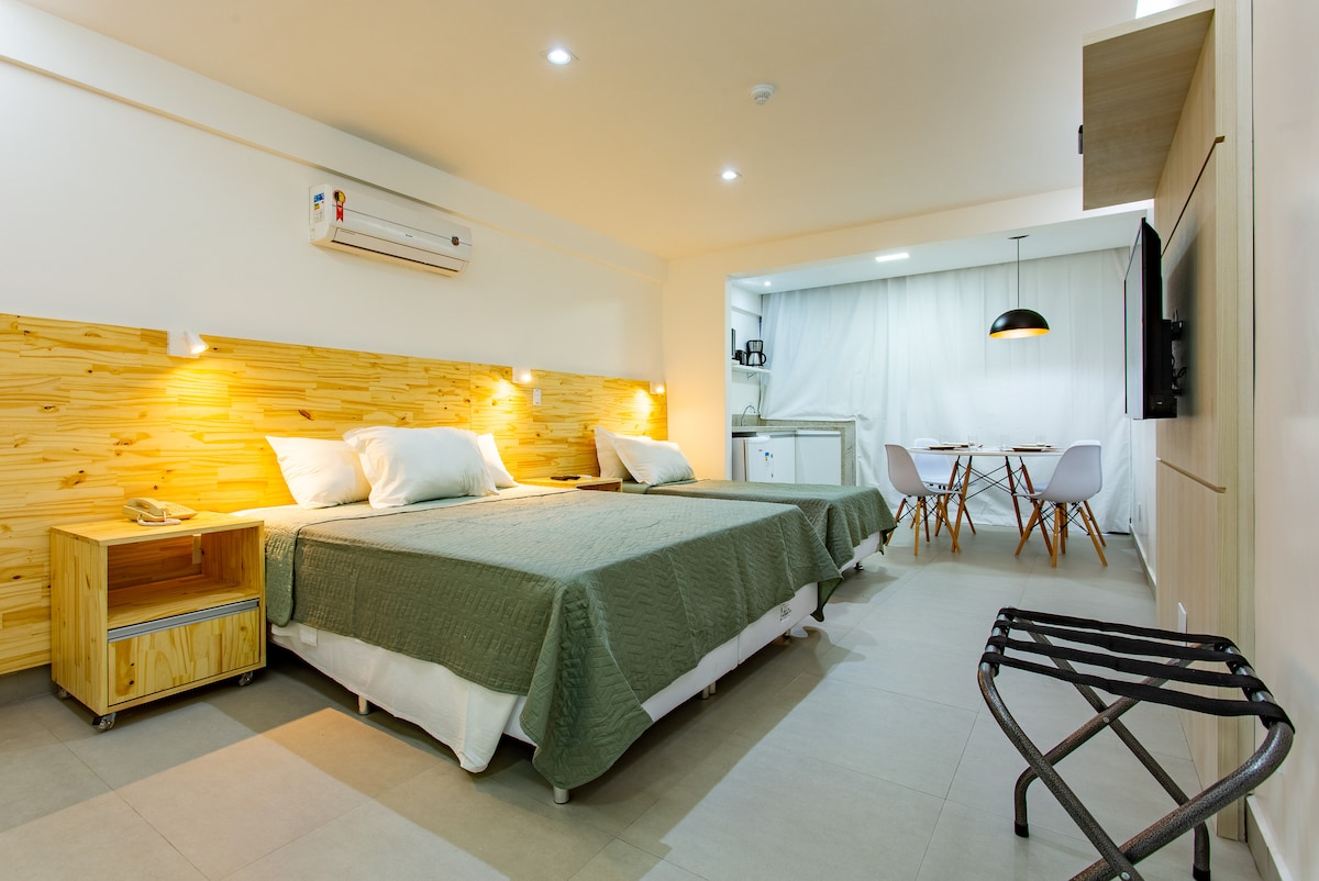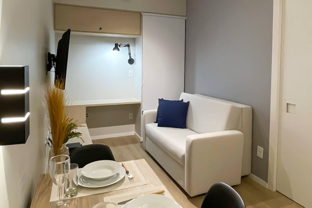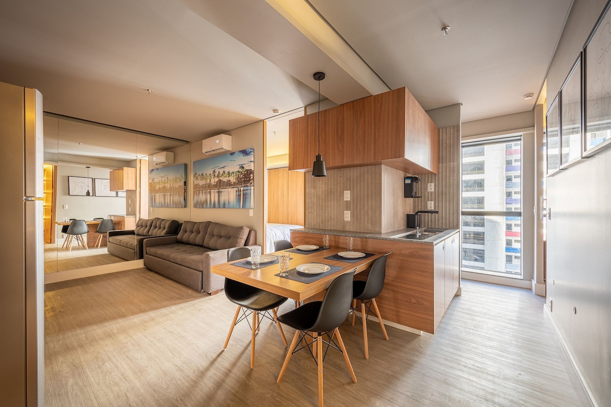 Abrace o estilo neste lugar tranquilo e bem localizado. A unidade "Praiana" é o seu lugar com estilo, tranquilidade e localização perfeita em Brasília. Está localizada no Plano Piloto e fica a poucos passos de Supermercado, restaurantes, farmácia 24h, padarias, salão, cafeterias. Disponibilizamos máquina lava e seca na unidade. É um PEQUENO espaço (18 m²) que possui tudo que você precisa. Cozinha equipada, secador de cabelo, ferro de passar roupa e uma decoração única. Decorada por design!