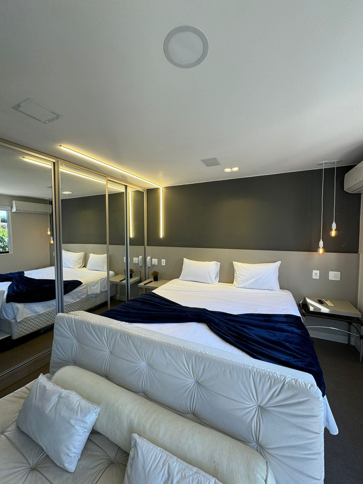 Apartamento de luxo no DF Plaza, em Águas Claras, ideal para casais ou executivos. Possui cama queen, sofá-cama, ar-condicionado, Wi-Fi e cozinha equipada. Decoração moderna e funcional. Localizado dentro do shopping, com acesso a restaurantes, supermercado, farmácia e academia. O prédio oferece piscina, lavanderia, estacionamento gratuito e portaria 24h. Conforto e praticidade em ótima localização.