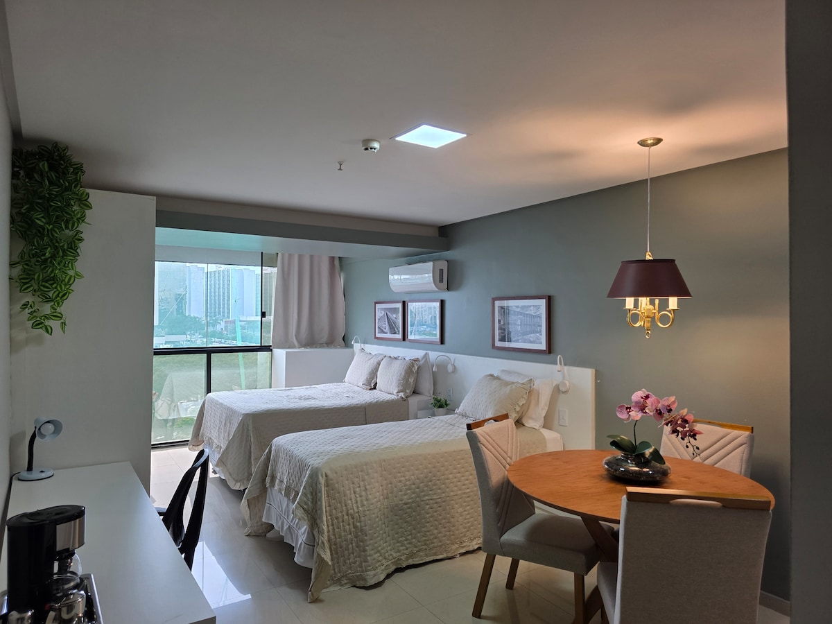 Nosso espaço conta com design moderno para que nosso hóspede viva uma experiência marcante na Capital Federal. O studio possui cozinha americana completa com utensílios e eletrodomésticos. Dispomos de ar condicionado split, smart TV , internet de alta velocidade, banheiro , iluminação confortável, escrivaninha com cadeira, guarda roupa, cama tamanho padrão,colchão confortável, roupa de cama, toalhas de rosto e banho, check-in facilitado. A 2 minutos para o Parque e também para o centro clínico.