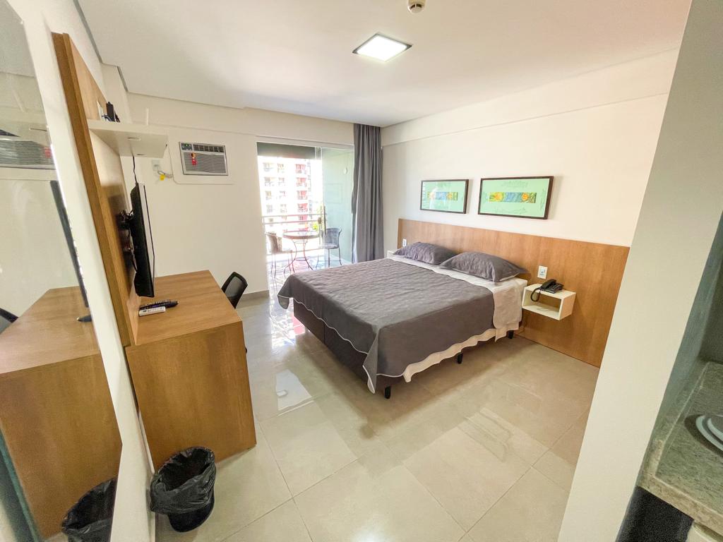 Apto no Hotel Garvey, Setor Hoteleiro Norte, Q 02 Bl J. O Apto totalmente reformado, composto de cama de casal Queen, TV smart, tv a cabo, mesa de trabalho c/ cadeiras, internet e ar condicionado. Composto de cozinha compacta, cafeteira, micro-ondas, Frigobar, Filtro de agua (gelada e natural), pratos, garfos, copos, tacas, talheres, canecas, ferro de passar, secador de cabelo (não permitimos fogão elétrico ou indução), roupa de cama e banho, papel higiênico, sabonete e shampoo.