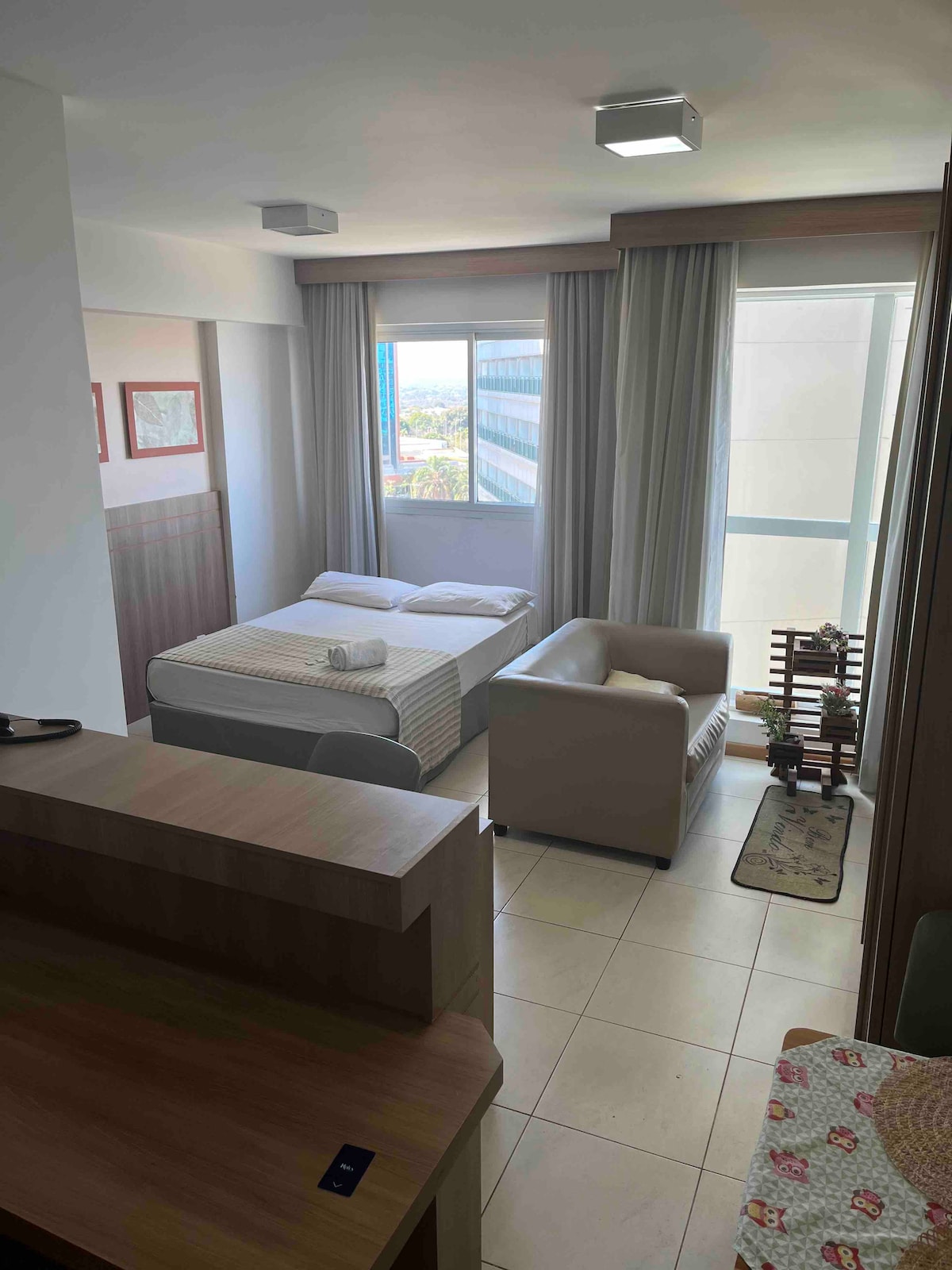 At the Cullinan Hplus Premium hotel. Very new and contemporary. Amazing location! Two malls across the street. Great tourist spots to go on foot. Charming, finely decorated and furnished unit. On the highest floor, with a beautiful view of Brasília and Asa Norte. 29m² luxury suite with king bed. Well equipped with several items for your convenience. Acoustic insulation on the windows for a great rest. Smart TV. Garage. Swimming pool, gym, sauna and restaurant. Check in 24 hours at reception.