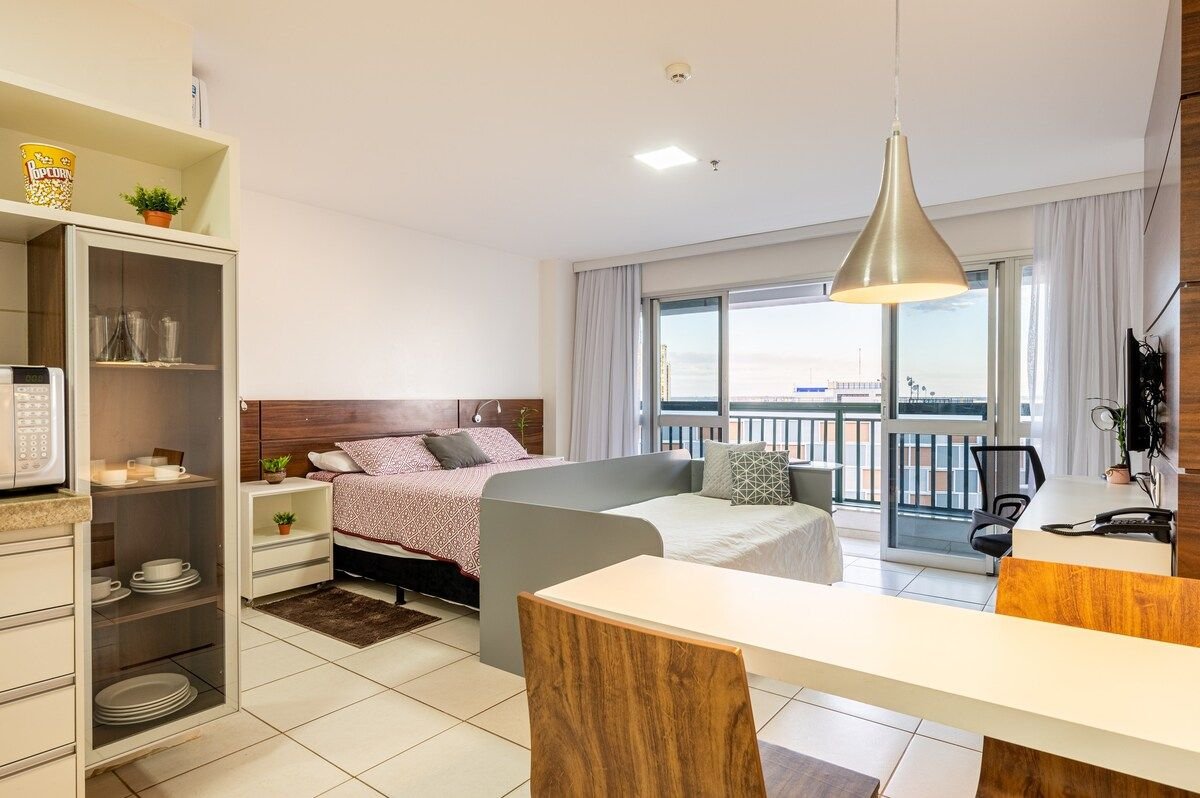 Abrace o estilo neste lugar tranquilo e bem localizado. A unidade "Praiana" é o seu lugar com estilo, tranquilidade e localização perfeita em Brasília. Está localizada no Plano Piloto e fica a poucos passos de Supermercado, restaurantes, farmácia 24h, padarias, salão, cafeterias. Disponibilizamos máquina lava e seca na unidade. É um PEQUENO espaço (18 m²) que possui tudo que você precisa. Cozinha equipada, secador de cabelo, ferro de passar roupa e uma decoração única. Decorada por design!