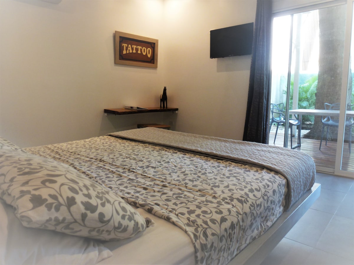Escape to our unique, adults-only Scandinavian-style studio, crafted from a modern shipping container. Perfect for 2, this serene retreat features a king bed, kitchenette, and high-speed Wi-Fi. Relax by the shared lap pool in our tropical oasis, just a 2-minute walk from the vibrant town center. A stylish and peaceful getaway awaits.