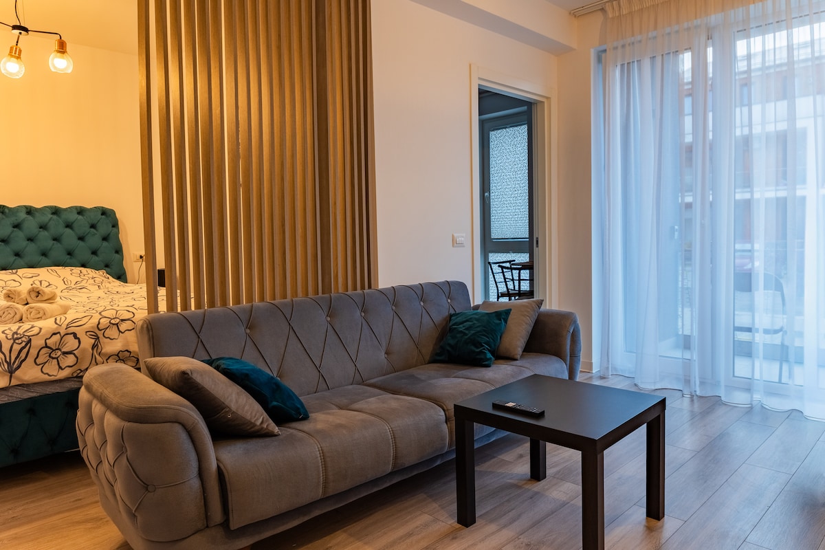 Ultramodern fully equipped apartment with private parking and smart lock for check in / check out. It is located in brand new residential area - Cartier Coresi, near the Coresi Shopping Resort, at 10 minutes from the historic center. It has a bedroom with queen size bed, living room with expandable sofa bed, fully equipped kitchen, air conditioning, large terrace with hammock, washing machine / dishwasher, two 4k TVs with Netflix and HBO Go.