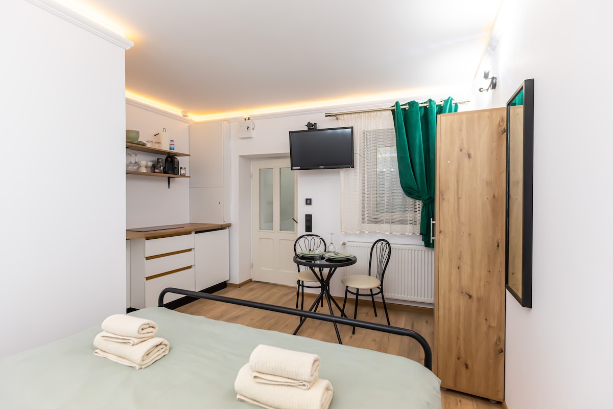 Welcome to our cozy studio in the heart of Brașov’s Old Town! Just steps from top attractions like Council Square and the Black Church, it’s tucked away in a quiet, charming area. Perfect for couples or solo travelers, the space features warm decor, a comfy bed, a fully equipped kitchenette, and a modern bathroom. Explore historic streets, cozy cafes, and scenic trails, then relax in your peaceful retreat. The perfect home base for your Transylvanian adventure!