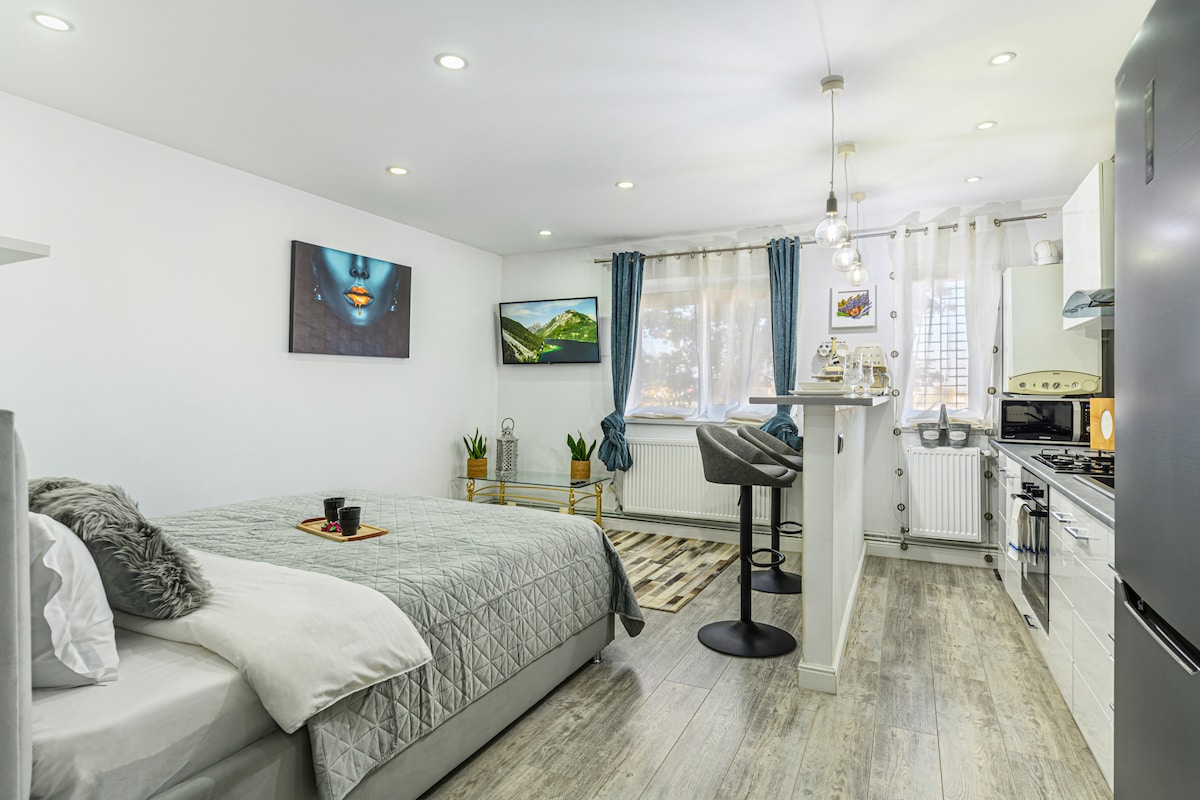 Welcome to Bella Vista Studio, a cozy space in Brașov’s dynamic Coresi district. Enjoy a private terrace with courtyard views, a Smart TV with streaming apps, and a fully equipped kitchenette: induction cooktop, microwave, fridge with freezer, coffee maker, toaster, kettle. For extra comfort: hairdryer, iron, ironing board and vacuum. Perfect for business or leisure. Book your stay today!