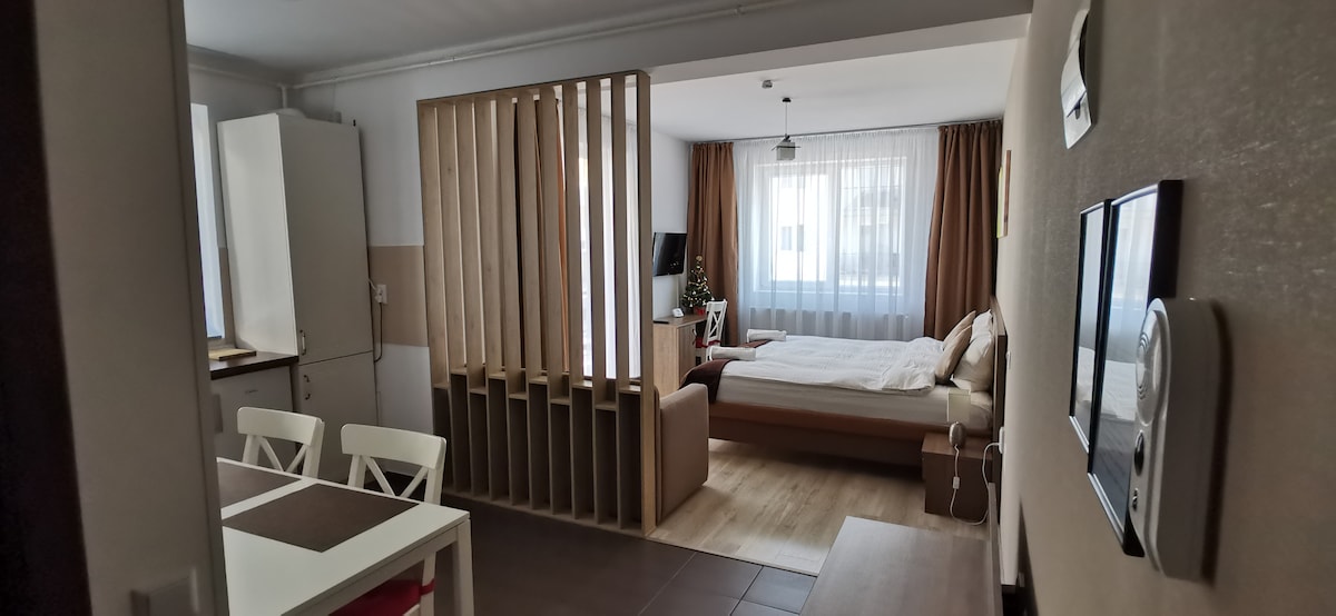 Our cozy bright new renovated Studio is located in a good place of Braşov , in central zone , with great access to old town ( 15 minutes far by walking and 4”5 min by bus ) with a furnished balcony to enjoy of Mountain View and Tampa Braşov . We will be so happy to be your host and take care of your wishes , give you support and information.