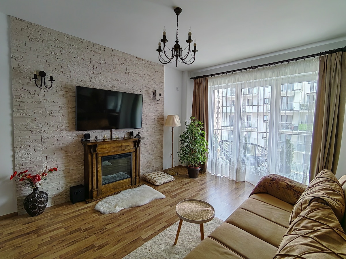 We welcome you to our new charming apartment located in the "youngest" part of Brasov. Fully furnished, a bedroom with a generous king size bed and a cozy window seat, a retro style bathroom with walk-in shower, a living room with bar, fireplace, one comfortable sofa and a fully equipped kitchen, in open space. The apartment is at 5 minutes walk to Coresi Shopping Center and 20 minutes by bus to the Old City Center (4 km distance). The train station is at 15 minutes by bus (2 km).