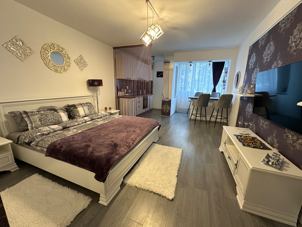 The best place for couples Modern studio newly refurbished with natural light most of the day, welcoming, intimate and cosy. 10 minutes walk to Coresi Brașov Shopping centre 30 minutes walk to Old City centre The location is opposite the Brasov train station 🚆 The bus and taxi station are at 100 meters distance and will take you to the tourist destinations The studio is on the 10th floor and has a gorgeous view to the Coresi Shopping centre 2 elevators available Parking available on payment