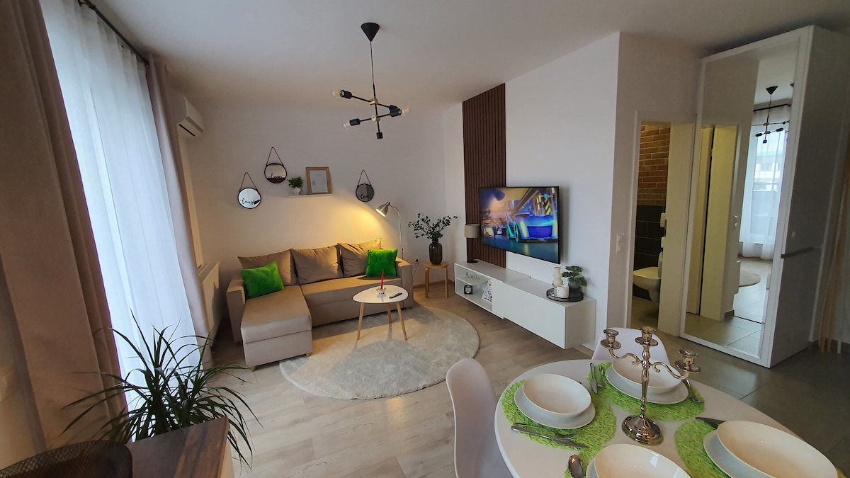 Elegant & quiet apartment right next to Coresi Mall. Perfect for relaxing after a busy day, it features a cozy bedroom, modern living room with Netflix, fully equipped kitchen, and a bright balcony. Ideal for both short city breaks and longer stays in Brașov, with shops, cafes, and entertainment just steps away!