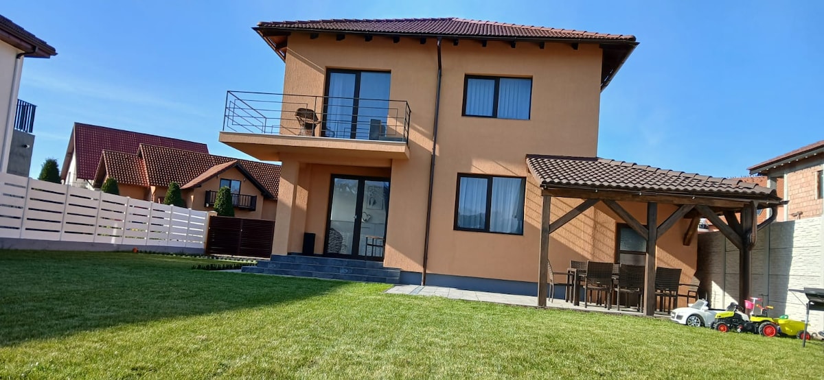 Luxury villa perfect for relaxation and fun. It features 4 double rooms with private bathrooms, a spacious living room, dining area, and fully equipped kitchen. The basement offers a billiard room, sauna, wine cellar for gatherings, and a PlayStation 5 for entertainment. Outside, enjoy a private hot tub, fire pit, shared sports field, and playground. Parking for 2 cars in the yard. Located 13 min from Brașov and 30 min from Poiana Brașov by car. Ideal for families and groups!