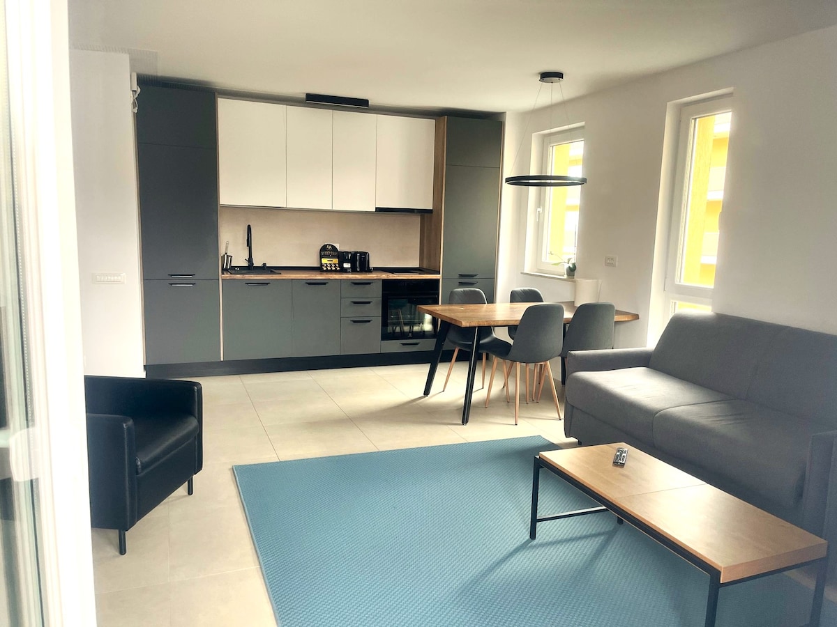 A uniquely and carefully designed, this apartment perfectly combines coziness with stunning Scandinavian accents. Situated in a new residential neighborhood, we go above and beyond to ensure a unique experience for our guests. Our home can accommodate up to 4 people and has its parking lot. The standout feature of this penthouse is the spacious terrace with a jacuzzi and a panoramic view over the mountains, being ideal for couples, business travelers, solo adventurers, or families (with kids).