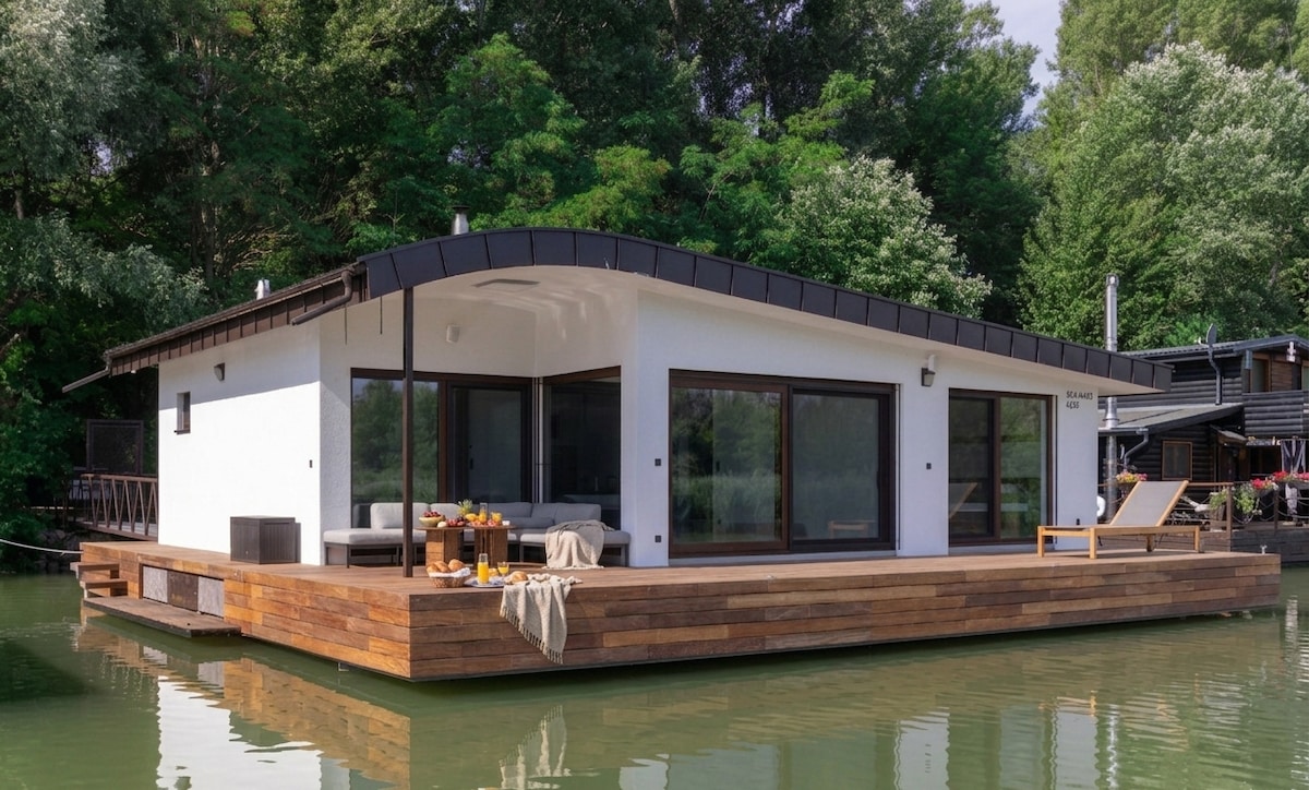 An unconventional vocation by the water in beautiful nature, but yet close to Bratislava.A comfortable,modern houseboat floating on the water with a forest at your back. A romantic atmosphere directly connected with the beauty of wild nature. Enjoy evening moments under the open sky watching the stunning sunset with a glass of wine, whether with your partner or family. From the terrace during breakfast,listen to the singing birds,rustling trees or watch fish swimming on the surface,ducks,beavers