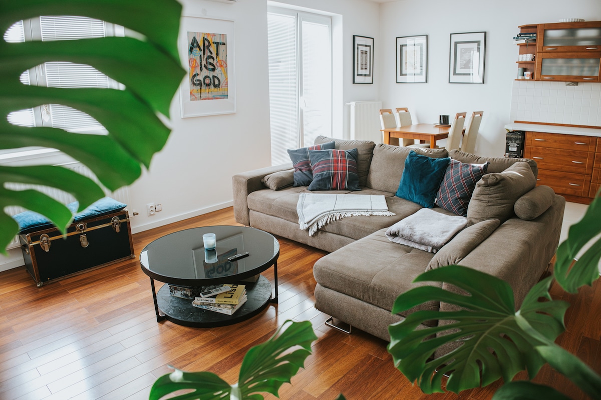 🎸 100m2 of Freedom! Stay in a stylish, soundproof 📷 photo studio with no 10 PM curfew. Front zone: 🎸guitar, vinyls, BT speaker & hammock for chill vibes. Enjoy 🎲board games or the mini-bar (🍷wine, 🍺 beer,sweet,salty). Back zone: private bedroom, kitchen, 📺TV with Netflix,HBO & large loggia. 📍 Neighborhood: Supermarket Billa, 🍻pub, 🍝restaurants. City center is 30 mins by walk. Perfect for creatives and travelers seeking space, music, and a unique experience without limits.