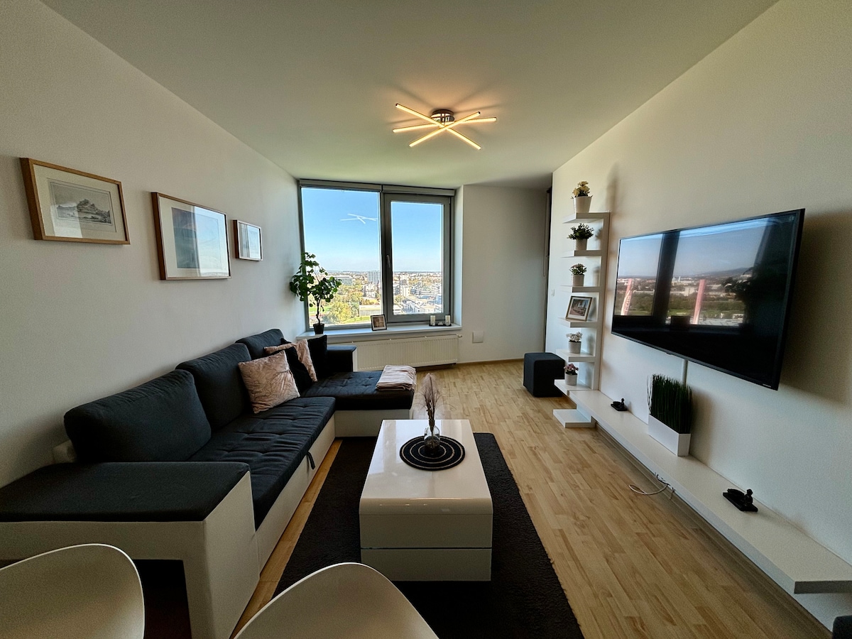 Vivi un’esperienza unica sopra Bratislava. Situato al 24° piano, questo appartamento panoramico offre una terrazza privata con vista sul castello, perfetta per godersi un aperitivo al tramonto o una cena in totale relax. A soli 100 metri dalla stazione principale degli autobus e a meno di 10 minuti a piedi dal centro storico, è la scelta ideale per esplorare la città con comodità In oltre è sempre disponibile compreso nel prezzo un posto auto nel garage.